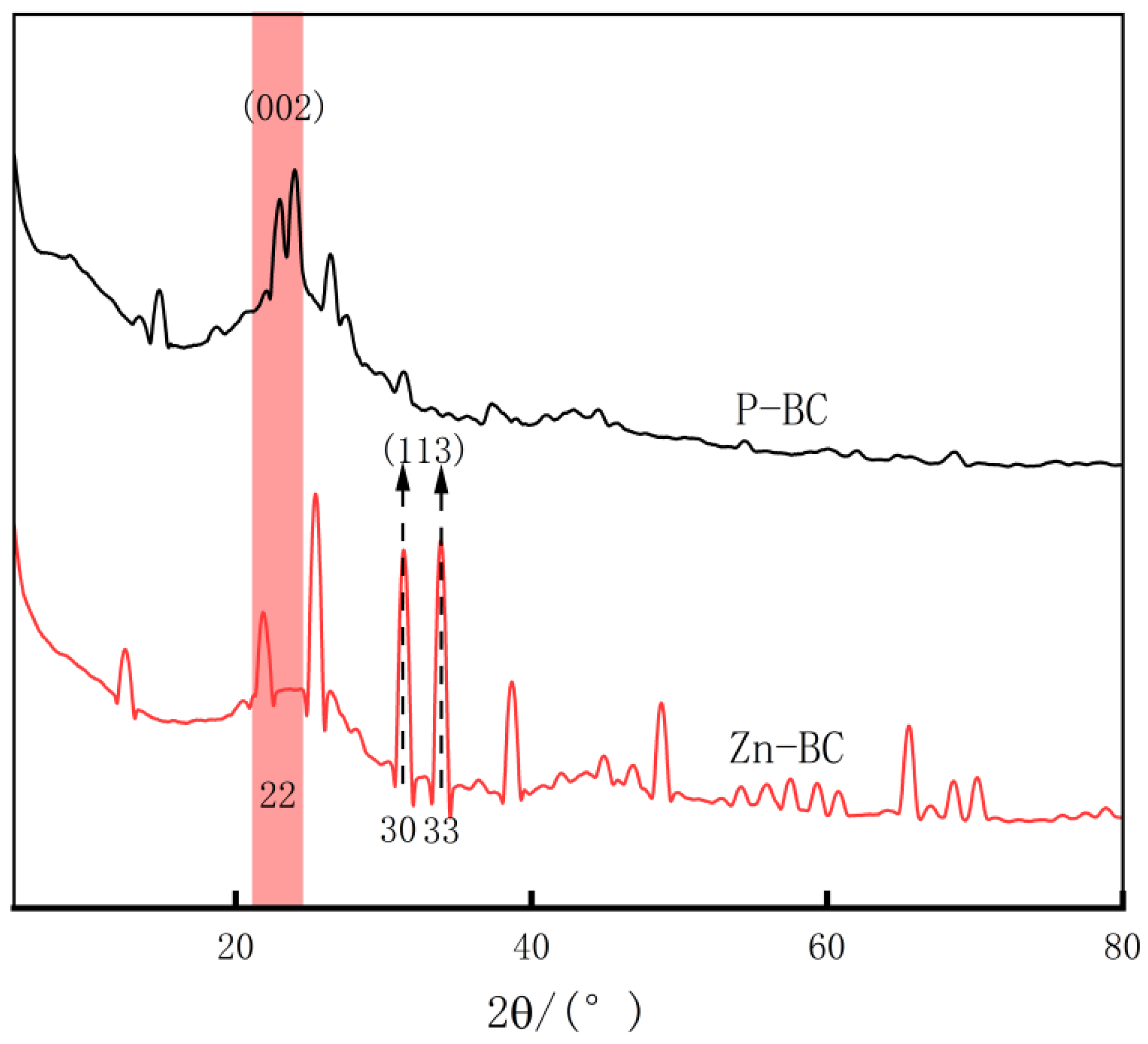 Figure 8 shows the XRD patterns of Zn-BC and P-BC. The broad and gentle diffraction peaks at 2θ = 22.5° and 2θ = 43.3° correspond to the (002) and (100) crystal planes of the amorphous carbon in the biochar. This indicates that the raw material forms a typical amorphous carbon structure after pyrolysis [28]. Notably, a sharp diffraction peak appears at 2θ = 30° in the pattern of Zn-BC, which is indexed to the (113) plane of Zn(OH)Cl. This confirms the presence of Zn in the form of Zn-OH, a finding that is mutually consistent with the FTIR results [29]. The XRD pattern of P-BC demonstrates comparatively weaker diffraction peak intensity, potentially resulting from its lower degree of crystallinity or dominant amorphous phases. Scherrer analysis was performed on the XRD data of the two modified biochars. The results showed that both the crystallite size (4.86 nm) corresponding to the graphite (002) crystal plane and the d002 interlayer spacing (0.407 nm) of P-BC outperformed those of Zn-BC (3.85 nm and 0.399 nm, respectively). This indicates that P-BC possesses a higher degree of graphitization and a more intensive aromatic ring condensation reaction [30].