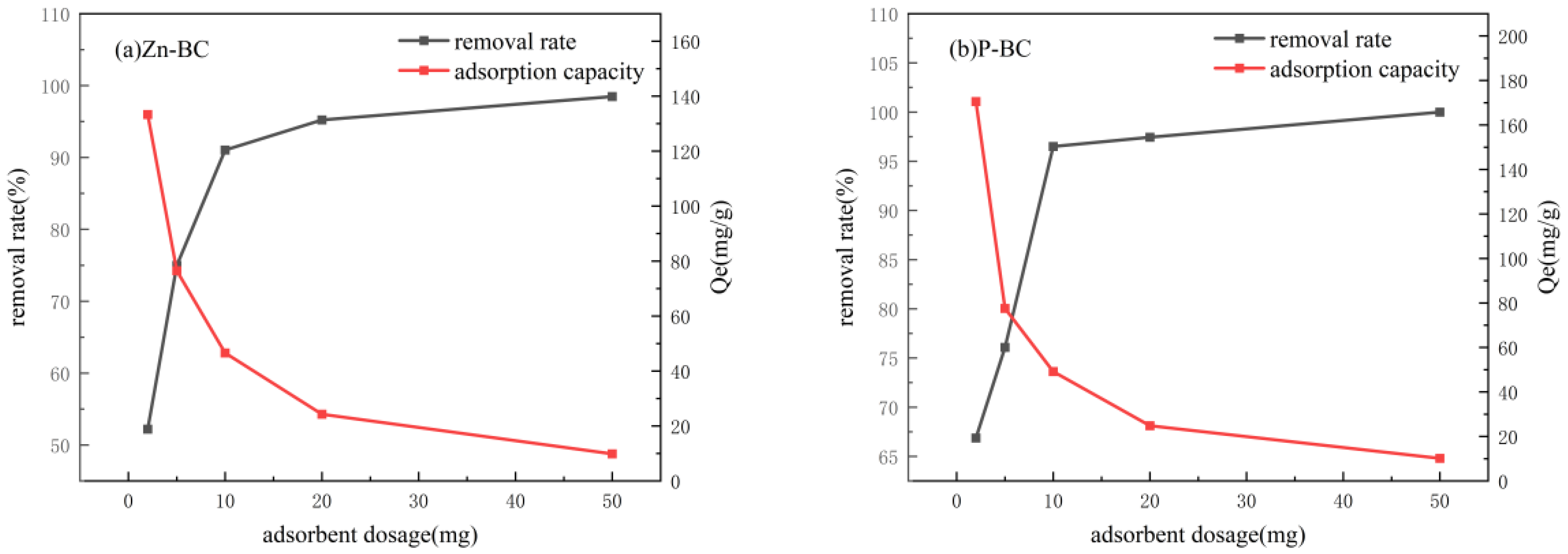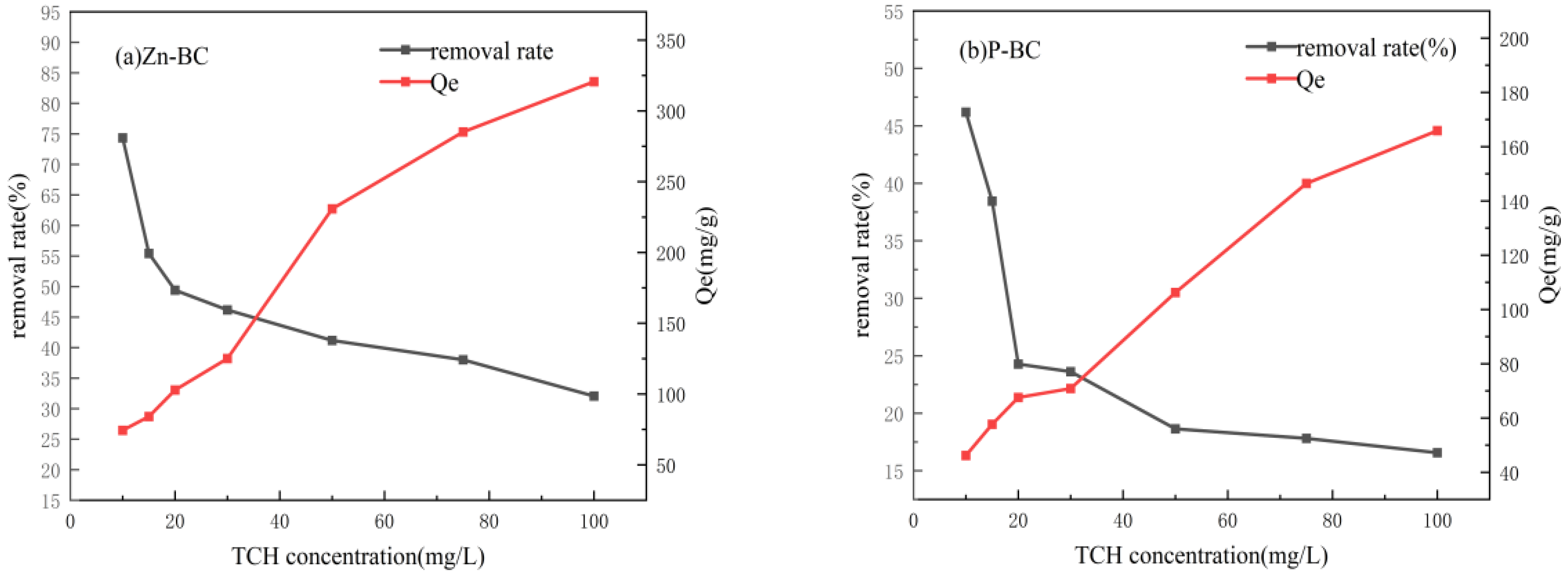 As shown in Figure 11, with an increase in the initial TCH concentration, the adsorption capacities of both Zn-BC and P-BC biochars exhibited an increasing trend, whereas the removal efficiency gradually decreased. Specifically, as the TCH concentration rose from 10 mg·L−1 to 100 mg·L−1, the adsorption capacity of Zn-BC increased markedly from 74.34 mg·g−1 to 320.62 mg·g−1, while that of P-BC increased from 46.19 mg·g−1 to 165.87 mg·g−1. At low concentrations (<20 mg·L−1), the abundant availability of adsorption sites on the biochar surface resulted in a rapid adsorption rate. However, as the concentration increased further with a fixed biochar dosage, the number of available sites per TCH molecule decreased, consequently leading to a slowdown in the rate of removal efficiency increase [35]. Under these conditions, the mass transfer driving force generated by the concentration gradient facilitates the migration of TCH molecules to the biochar surface, thereby promoting a continuous increase in adsorption capacity. A comparative analysis reveals that Zn-BC not only exhibits superior adsorption performance but also demonstrates greater adaptability to high-concentration TCH solutions [36].