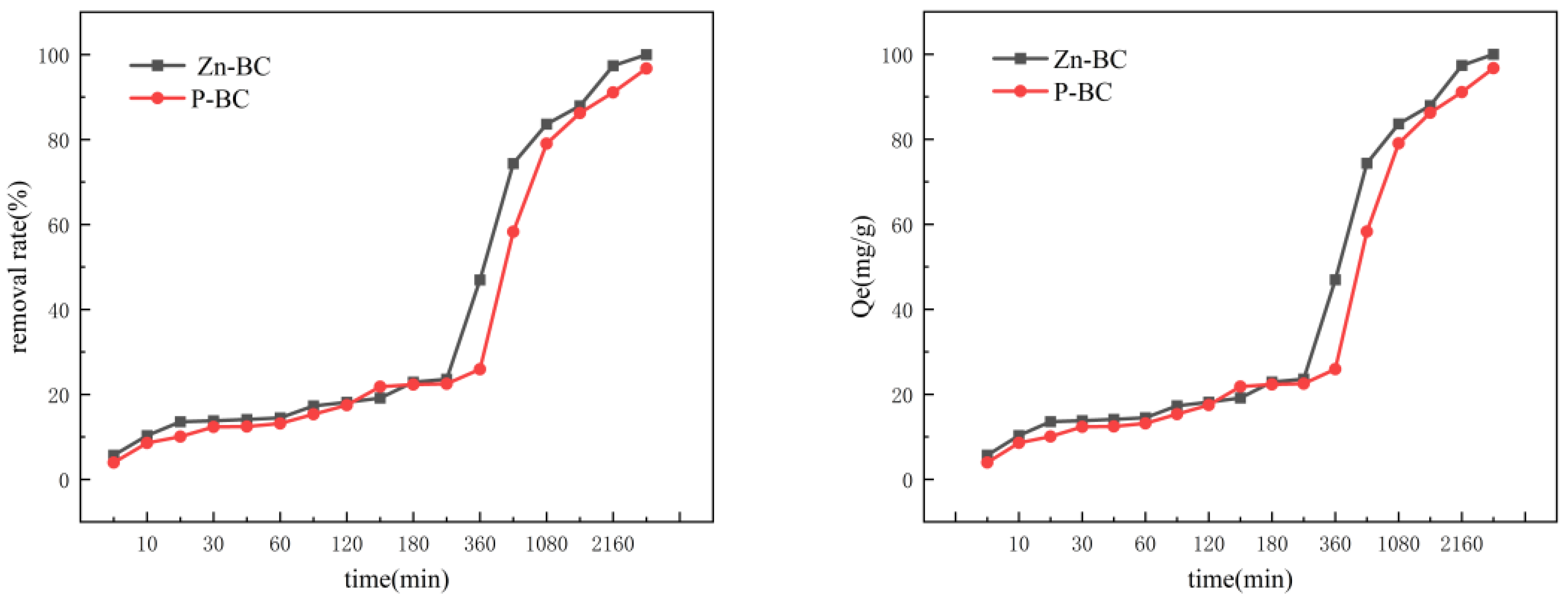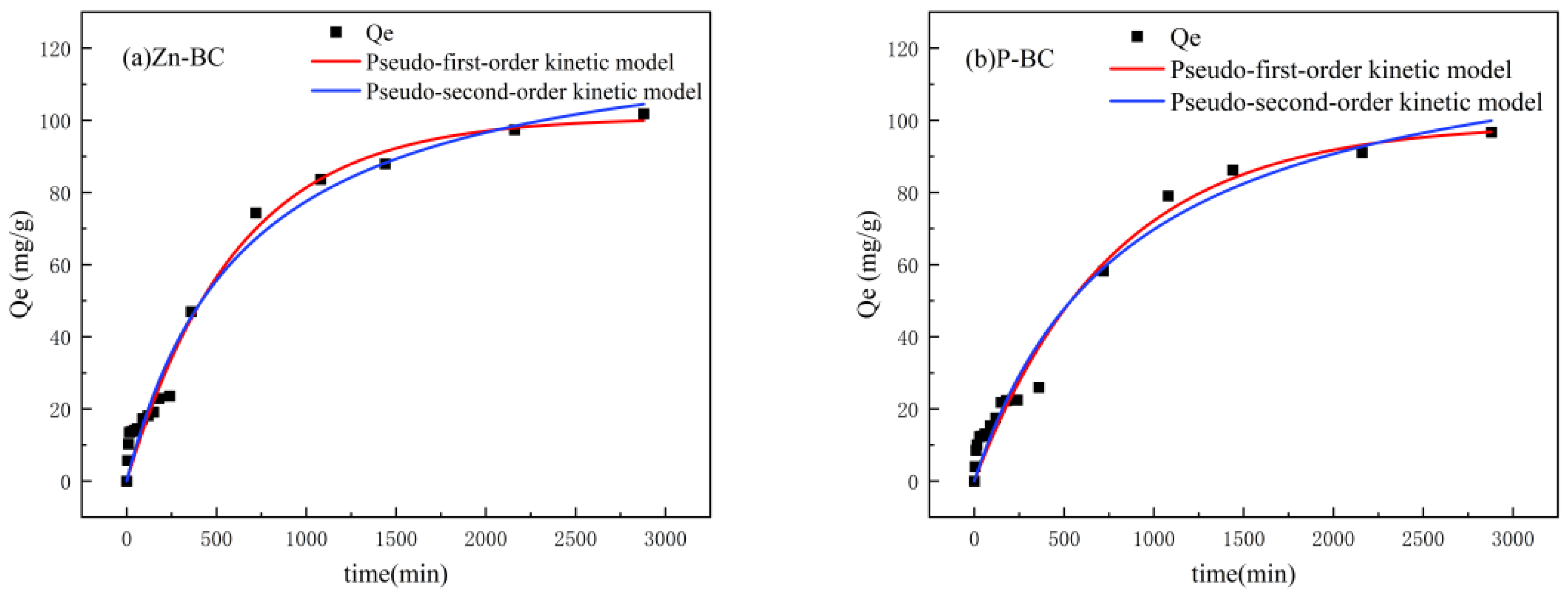 As shown in Figure 10, both Zn-BC and P-BC exhibited high initial adsorption rates for TCH. From 5 min to 720 min, the TCH removal efficiency of Zn-BC and P-BC increased from 5.69% and 3.97% to 74.34% and 58.29%, respectively. Correspondingly, the adsorption capacity rose from 5.69 mg·g−1 and 3.97 mg·g−1 to 74.34 mg·g−1 and 58.29 mg·g−1. As the adsorption progressed, the rate gradually decreased, but the process continued. At a contact time of 2880 min, the TCH removal rates for Zn-BC and P-BC reached 100% and 96.73%, respectively. This phenomenon can be explained by the abundance of available sites for TCH binding on the fresh biochar surface, leading to a rapid initial rate. As adsorption proceeded, these active sites became progressively occupied, and the TCH concentration in the solution decreased, resulting in a reduced concentration gradient and slower mass transfer. Consequently, the process approached equilibrium, and the adsorption rate declined [33]. Both modified biochars possess abundant micro-mesoporous structures, which lead to a multi-step adsorption process for TCH molecules including surface adsorption, pore diffusion and micropore filling. The diffusion resistance inside the micropores prolongs the time required for the adsorption process to reach equilibrium [34].