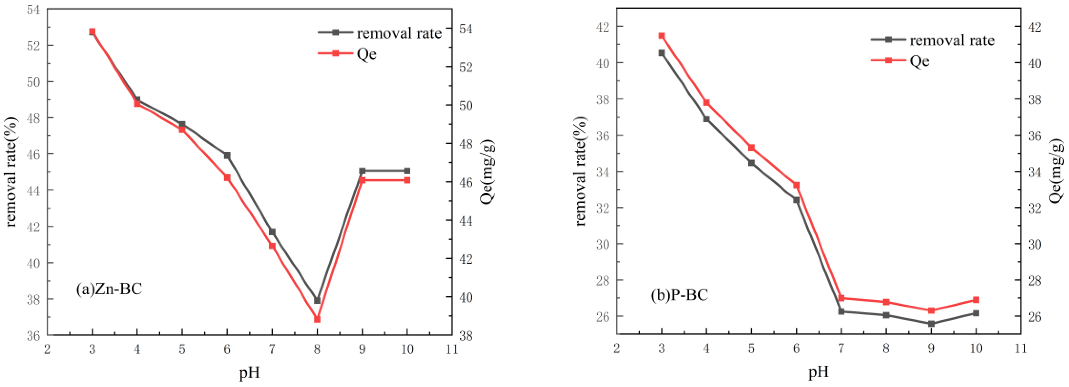 In the experiment, a hydrochloric acid (HCl)/sodium hydroxide (NaOH) titration method was employed to adjust the pH of the system. Moreover, tests using calcium chloride (CaCl2) confirmed that a low ionic strength exerted no impact on the adsorption equilibrium. As shown in Figure 12, the adsorption capacity and removal efficiency of TCH by both Zn-BC and P-BC demonstrated a declining trend as the pH increased from 3 to 8. Specifically, the removal efficiency of Zn-BC decreased from 52.70% to 37.91%. However, as the pH continued to rise, the removal efficiency of Zn-BC gradually recovered and eventually stabilized. This phenomenon can be explained by the fact that under acidic conditions, TCH exists predominantly as a cation, while the Zn-BC surface is negatively charged, thereby promoting adsorption through electrostatic attraction [37]. When the pH exceeds the dissociation constant (pKa ≈ 7.68) of TCH, the TCH molecule is converted into an anionic species. Meanwhile, Zn2+ undergoes hydrolysis and precipitation. The generated Zn(OH)2 can also directly adsorb TCH molecules through hydrogen bonding and electrostatic attraction. At this point, Zn-BC facilitates adsorption through the cation bridging effect, where Zn2+ provided by ZnO complexes with TCH, leading to the recovery in removal efficiency [38]. Similarly, P-BC relies on electrostatic attraction to adsorb cationic TCH under acidic conditions. However, as the pH increases, this electrostatic interaction weakens. Since P-BC lacks metal oxides to provide bridging cations, its removal efficiency shows no recovery trend [39].