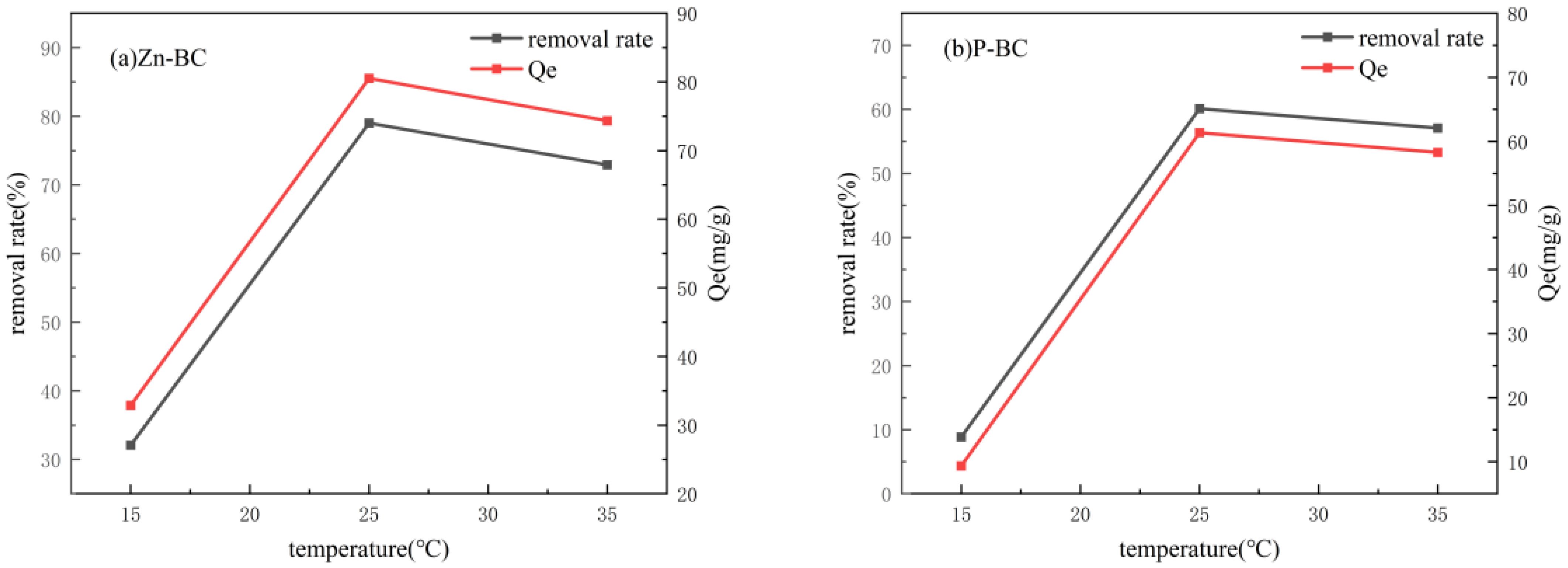 Figure 13 depicts the variation in TCH removal efficiency and adsorption capacity of Zn-BC and P-BC at different temperatures. As the temperature increased, the TCH removal performance of both modified biochars showed a trend of initially increasing and then decreasing. The enhancement in adsorption during the initial stage is primarily attributed to intensified molecular motion and improved mass transfer efficiency [40]. Table 2 presents the adsorption thermodynamic parameters of Zn-BC and P-BC. Their ∆H° > 0 indicates that the adsorption process is endothermic. Their ∆G° < 0 suggests that the adsorption process occurs spontaneously. Moreover, ∆S° for both materials is relatively large positive values, implying a significant increase in the disorder degree of the system, and desorption may be accompanied during the adsorption process. However, when the temperature exceeded a critical value, excessive thermodynamic energy likely induced desorption from the biochar surface, resulting in the release of a portion of TCH initially bound through physical interactions. This observation aligns with the Arrhenius theory, and the underlying mechanism will be further explored through subsequent kinetic simulations.