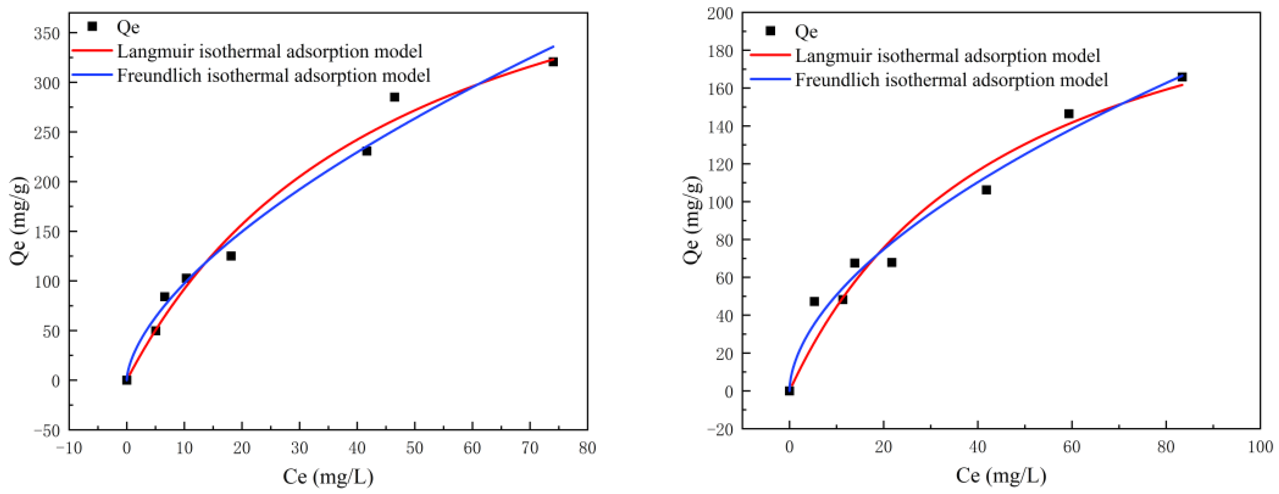 In the equations, Qe represents the unit adsorption capacity of the adsorbent at equilibrium, Qmax denotes the maximum adsorption capacity, Ce is the mass concentration of TCH in the solution at equilibrium, and KL, KF, and n are constants.