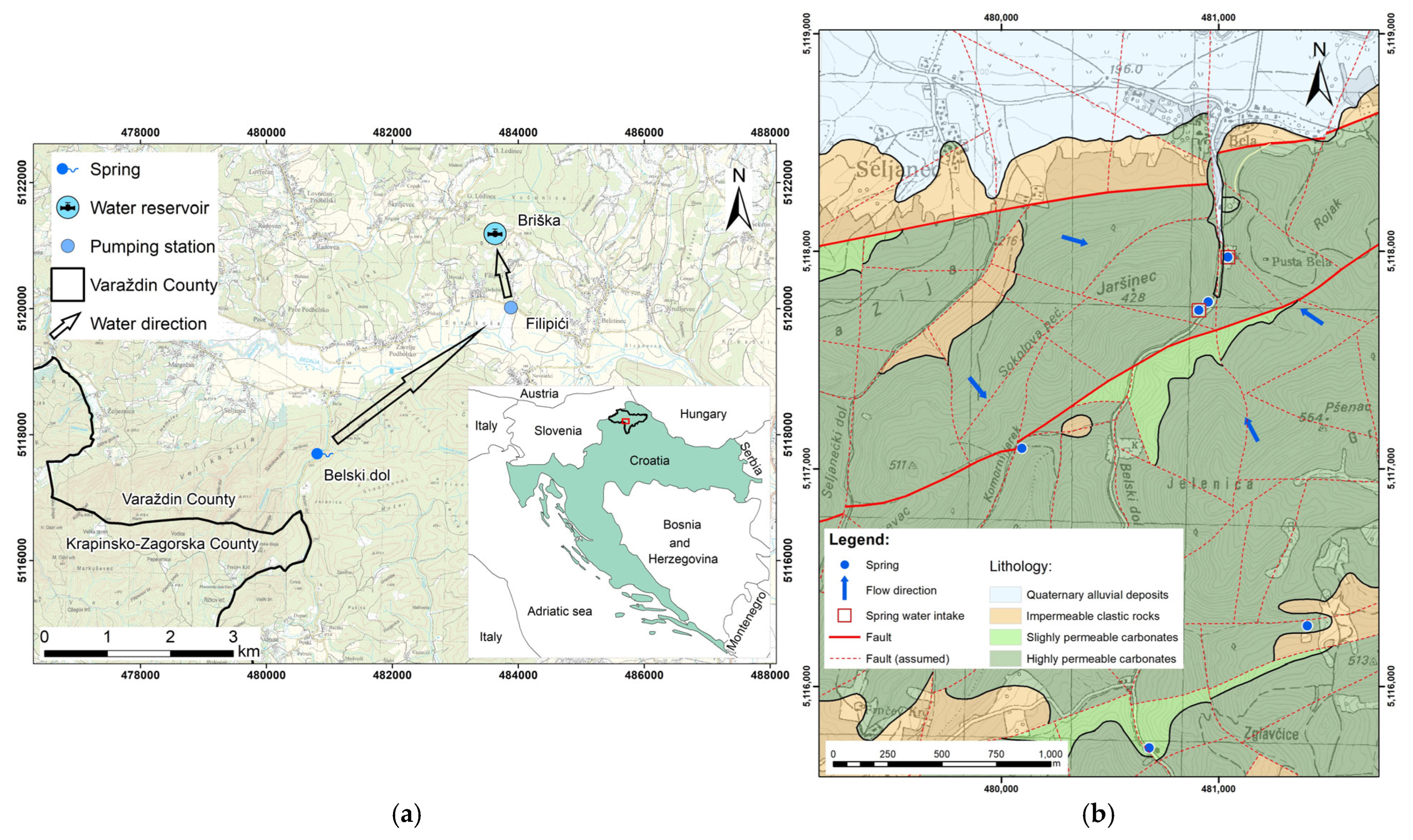 - RGN. Study on the Protection Zones of the Belski Dol Spring; Faculty of Mining, Geology and Petroleum: Zagreb, Croatia, 2008. (In Croatian) [Google Scholar]