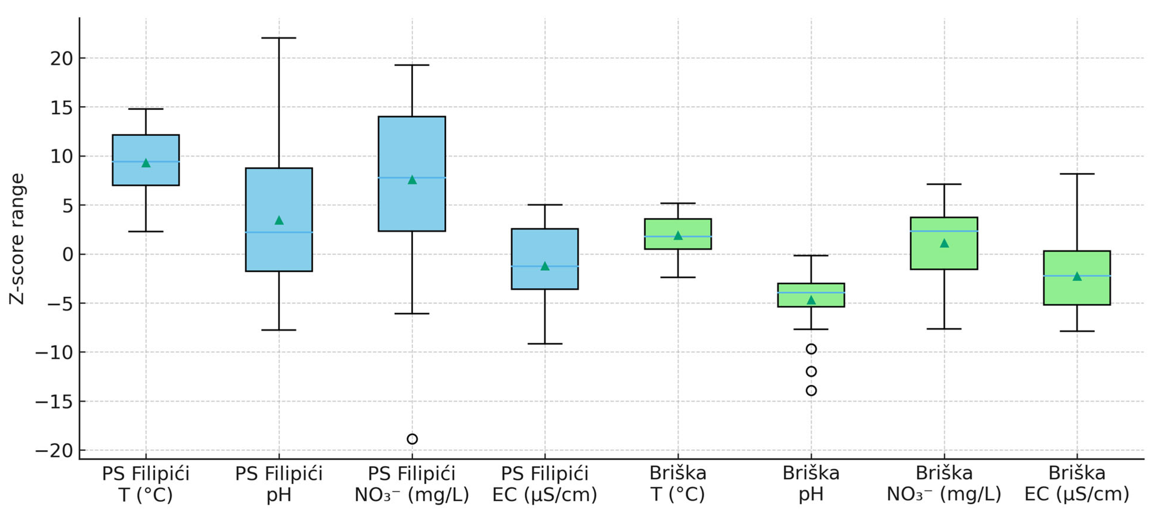 | Chlorides (Cl−) | Change over time | Salinization, urban runoff, agricultural return flow |