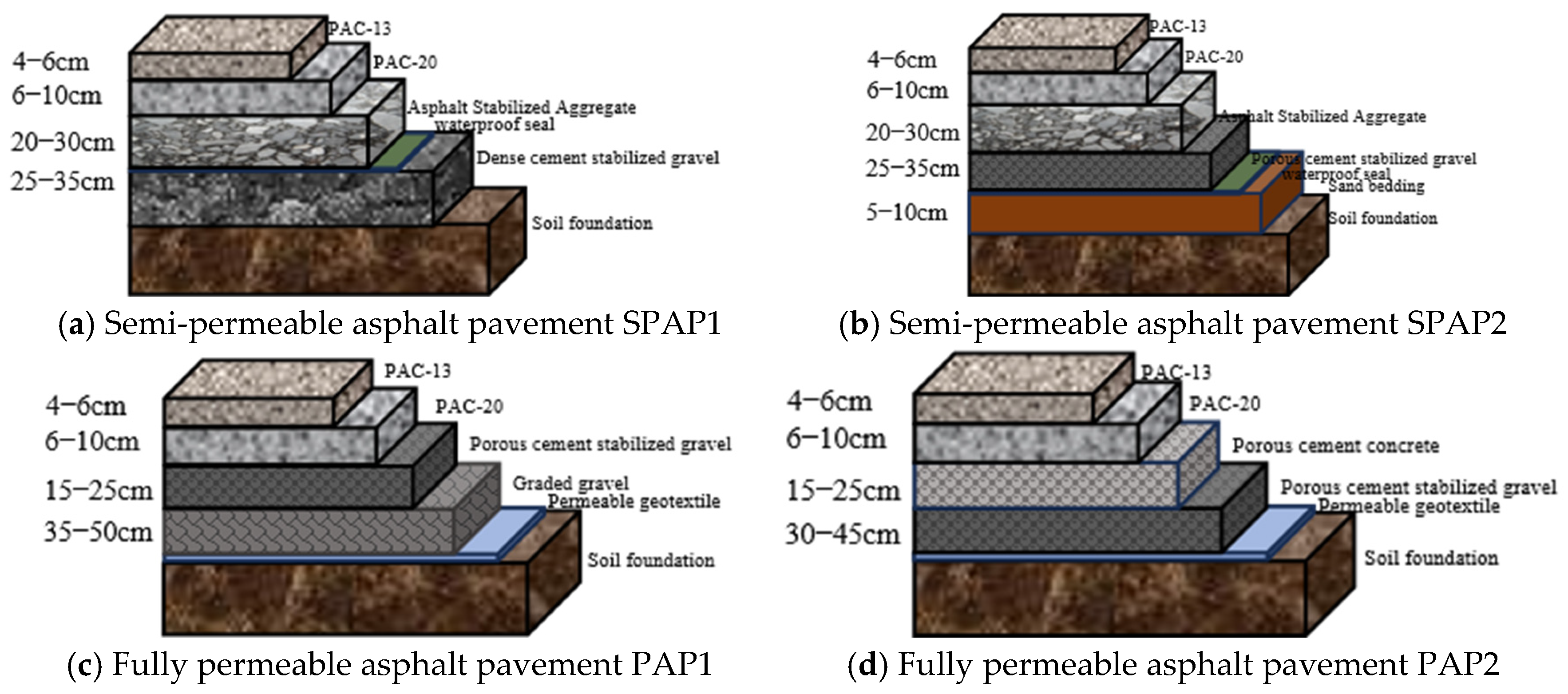 - A comprehensive analysis was conducted on the properties of various materials used in the structural layers of permeable asphalt pavements, considering the functional requirements of urban pavements. Based on this analysis, two semi-permeable asphalt pavements were designed: SPAP1, comprising PAC13, PAC20, asphalt-stabilized crushed stone, a waterproof sealing layer, and dense cement-stabilized crushed stone, and SPAP2, consisting of PAC13, PAC20, asphalt-stabilized crushed stone, porous cement-stabilized crushed stone, and a waterproof sealing layer. Additionally, two fully permeable asphalt pavements were designed: PAP1, comprising PAC13, PAC20, cement-stabilized crushed stone, graded crushed stone, and permeable geotextile; and PAP2, consisting of PAC13, PAC20, porous cement concrete, cement-stabilized crushed stone, and permeable geotextile. The void ratios and permeability coefficients of specimens made from these different materials were also measured.