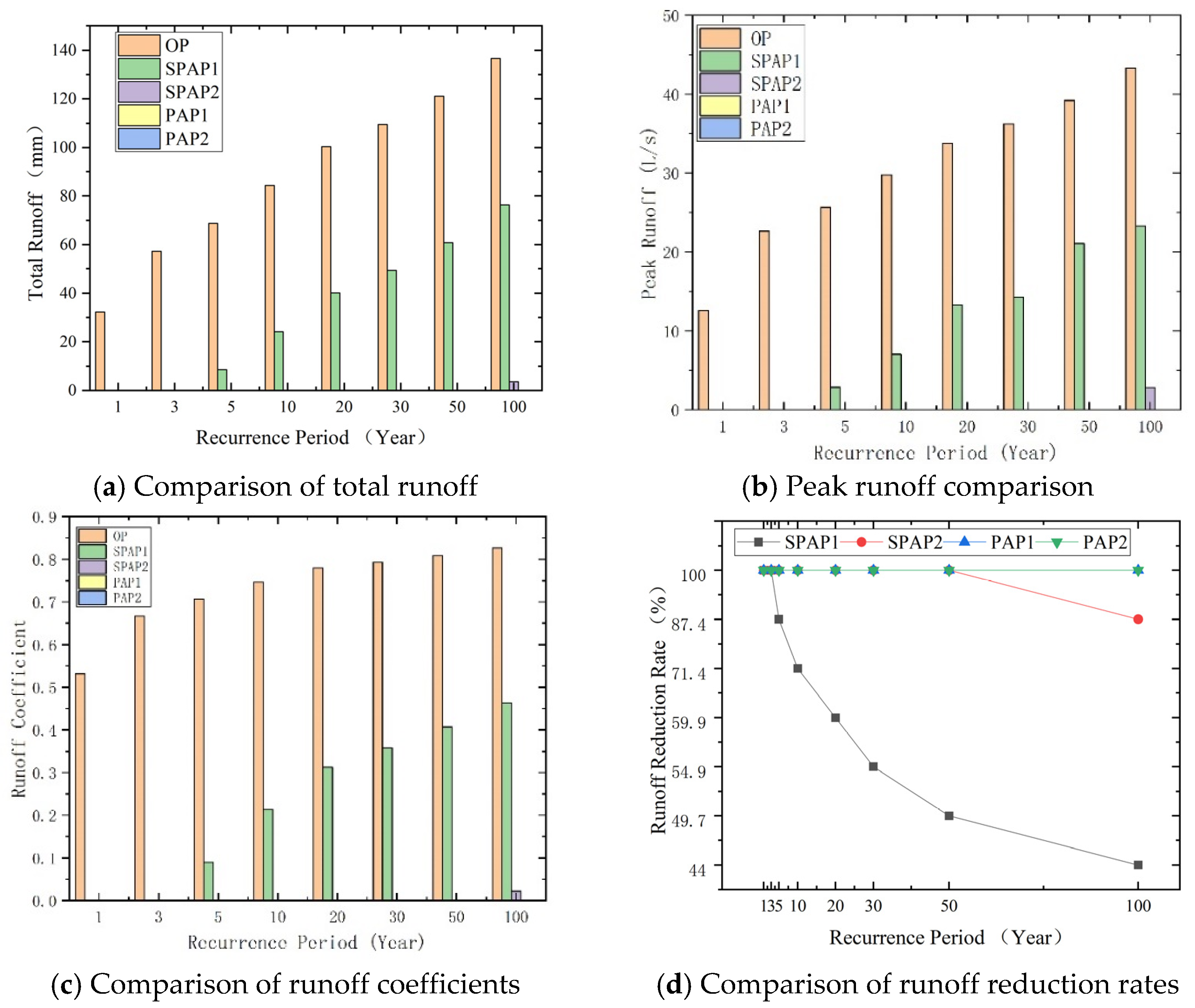 - SPAP1 delayed the peak runoff by an average of 10 min, achieving a surface runoff reduction ranging from 44% to 100%. SPAP2 delayed the peak runoff by an average of 1 h 10 min, with a surface runoff reduction ranging from 97% to 100%. No surface runoff was observed for PAP1 and PAP2, indicating a complete (100%) reduction in surface runoff.