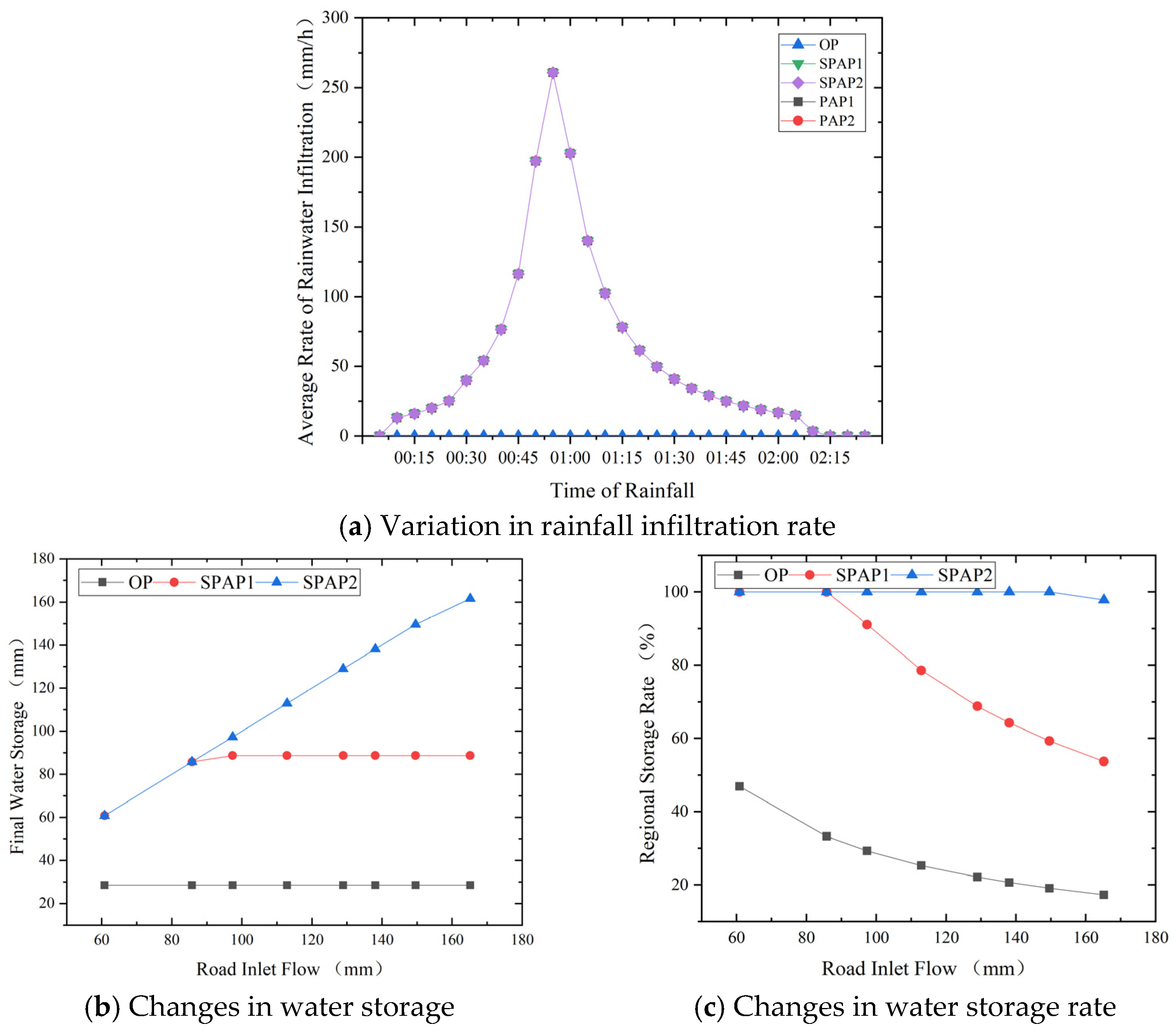 - SPAP1 reduced flow loading to the main pipe by 36–100% and water pressure loading by 25% to 50% and attained a maximum storage depth of 90 mm. SPAP2 reduced flow loading by 67–100% and water pressure loading by 50% to 64% and reached a maximum storage depth of 160 mm. PAP1 and PAP2 reduced flow loading to the main pipeline by 67–100% and water pressure loading by 50% to 64% and achieved groundwater recharge ranging from 61 mm to 177 mm.