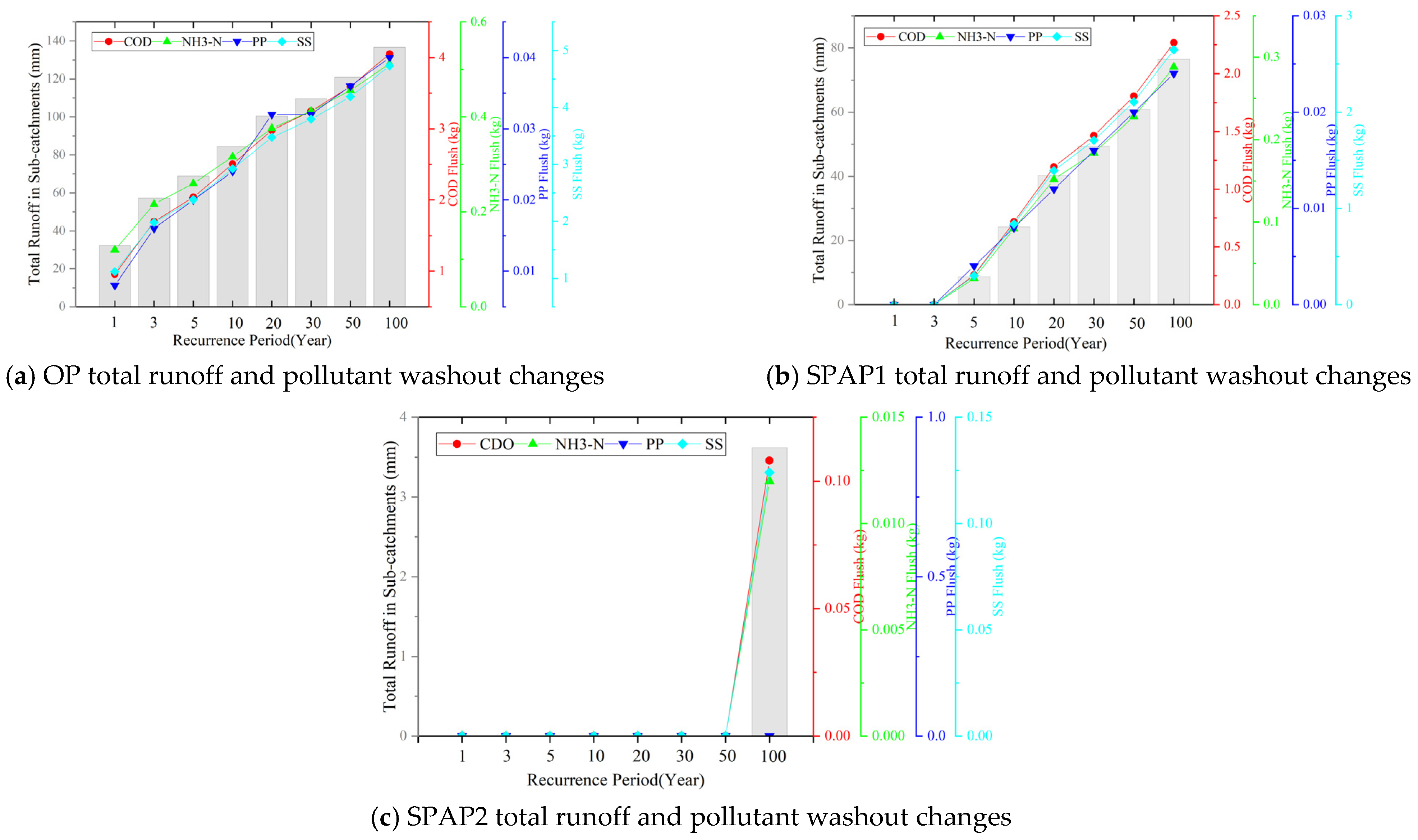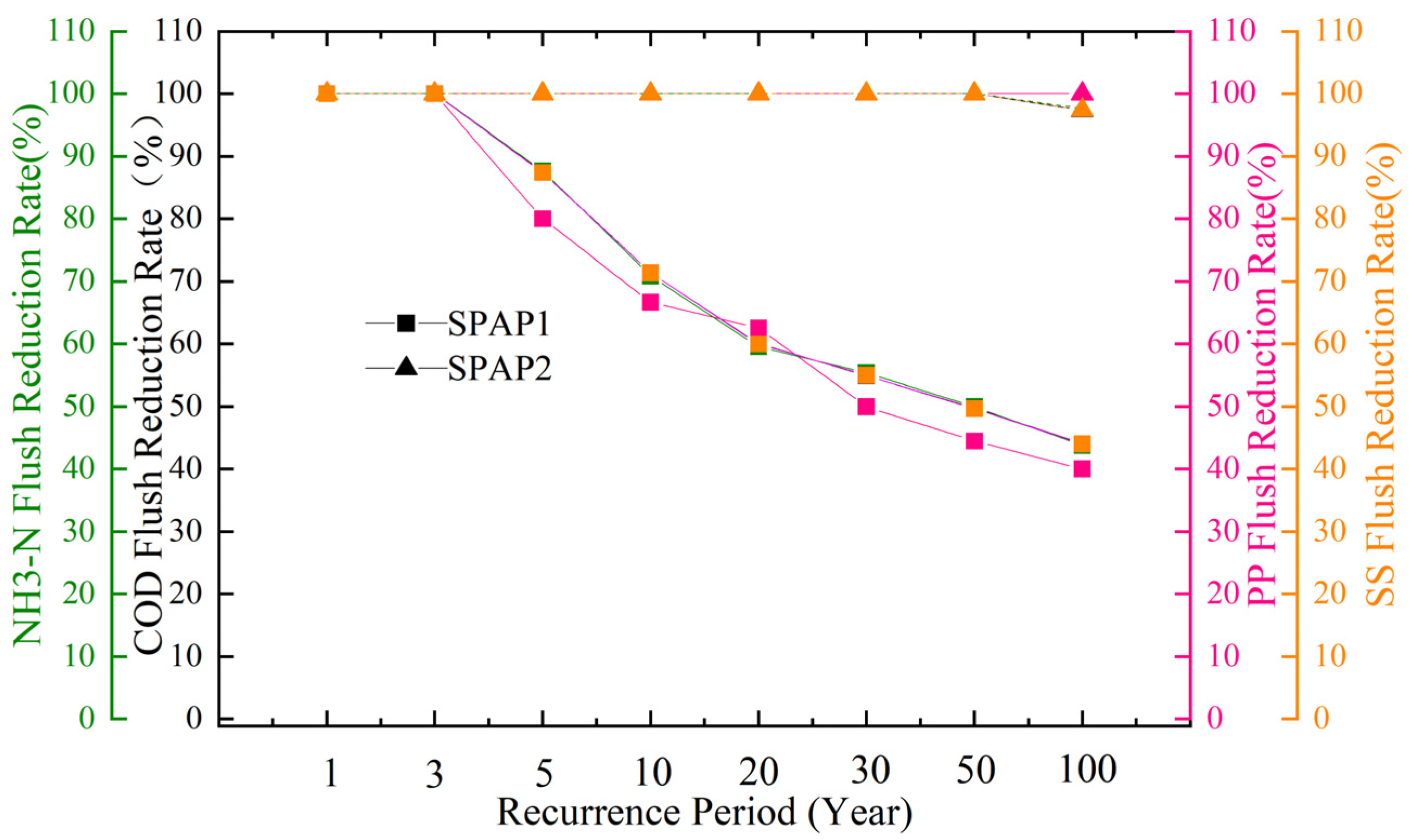 - SPAP1 reduced pollutants by up to 2.05 kg of COD, 0.26 kg of NH3-N, 0.022 kg of PP, and 2.4 kg of SS, with a total pollutant removal rate ranging from 28% to 78%. SPAP2 reduced pollutants by up to 5.3 kg of COD, 0.72 kg of NH3-N, 0.05 kg of PP, and 6.3 kg of SS, with a total pollutant removal rate ranging from 68% to 79%. PAP1 and PAP2 reduced pollutants by up to 5.92 kg of COD, 0.752 kg of NH3-N, 0.06 kg of PP, and 6.912 kg of SS, with a total pollutant removal rate ranging from 77% to 81%.