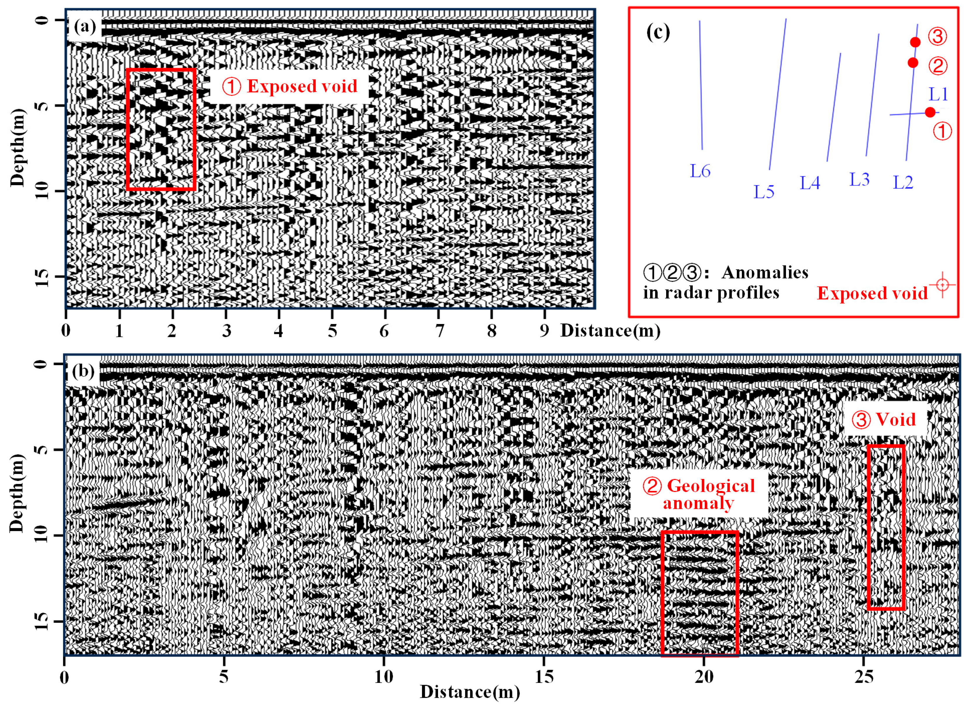 | 6 | GPR acquisition | Drained | Near-baseline | Zond-12e c, 75–150 MHz | Void-type signature on L1; anomalies on L2 | Figure 2c and Figure 5 |