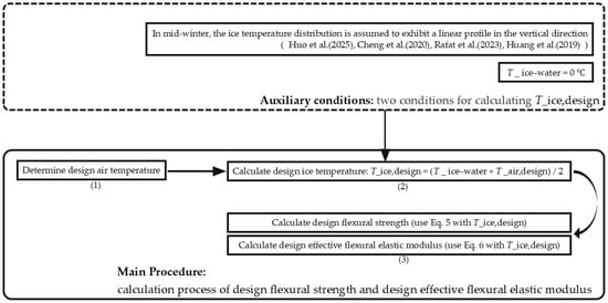 - Utilizing the analytical methodology proposed by Wang et al. [4], and considering that the design air temperature in cold-region engineering serves as a conservative indicator reflecting how “warm” the winter season can be, this study first analyzed the daily mean air temperatures during the conservative operational periods of different aircraft types from 1993 to 2024. For each aircraft type, the average value and standard deviation of the daily mean air temperatures within its respective conservative operational periods were calculated. The sum of these two values—the average plus one standard deviation—was then defined as the design air temperature for the aircraft in this study. Based on this design air temperature, the corresponding design ice temperature was obtained by averaging the design air temperature and the ice–water interface temperature, under the assumption of a linear vertical temperature distribution within the ice cover. The subsequent steps for determining the design flexural strength and the design effective flexural elastic modulus are summarized in Figure 7. Specifically, the design ice temperature derived above is used to calculate the design flexural strength according to Equation (5), and the design effective flexural elastic modulus according to Equation (6). Following this procedure, the design ice temperature of the An-2 aircraft at the potential Huhenuoer Lake ice runway was determined to be −9.8 °C, corresponding to a design flexural strength of 2800 kPa and a design effective flexural elastic modulus of 3.24 GPa. The same analytical process was applied to the Bombardier Q400 and Gulfstream G650ER to derive their respective design values.
