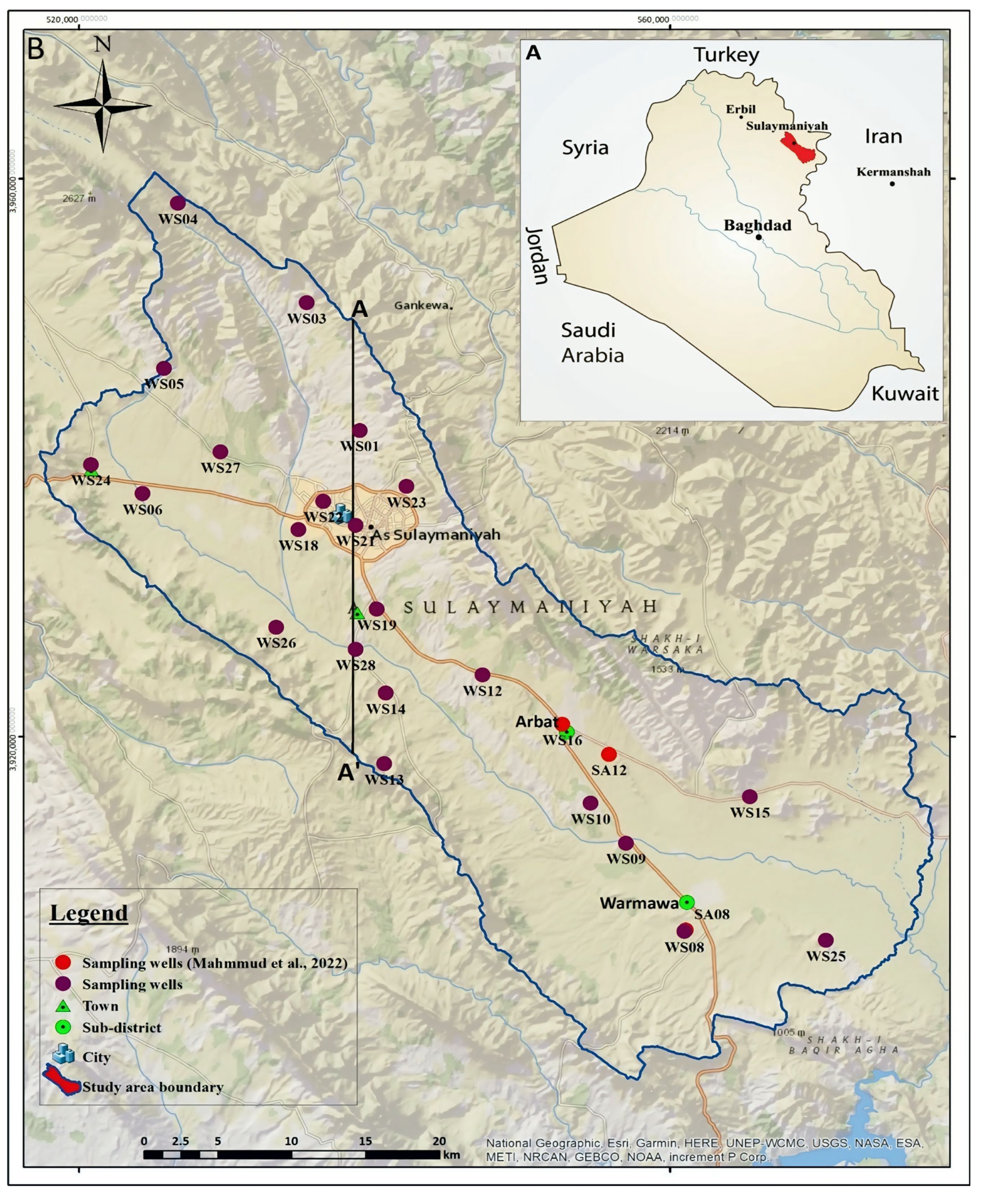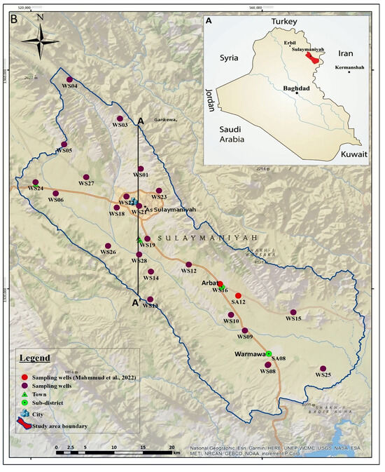 The area of study is the Sulaimani–Warmawa Sub-basin (SWSB), located in the Kurdistan Region of Iraq near Sulaimani City (Figure 1A). From a hydrological viewpoint, it is a sub-basin that is a part of the Sulaimani-Sharazoor basin in the Sulaimani Governorate [24]. It is a semiarid area with a Mediterranean climate, and most of the precipitation falls in the winter months. Groundwater is a vital water resource in the area, given that most streams are perennial and typically experience declining water levels and reduced discharge during late summer. From an economic viewpoint, the region is important because of its huge oil reserves, and several towns are booming due to the oil industry. The main city located inside the SWSB is Sulaimani, with approximately 790,000 inhabitants mostly dependent on groundwater for water supply. The Sub-basin has been studied by [19], and the principal processes responsible for groundwater chemistry evolution have been identified.