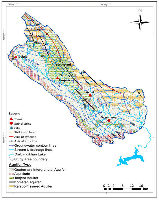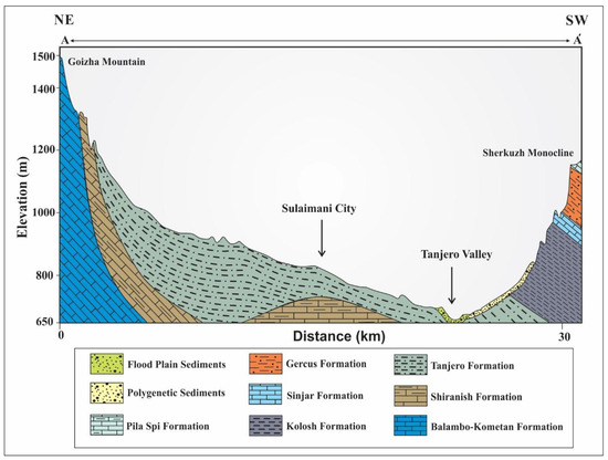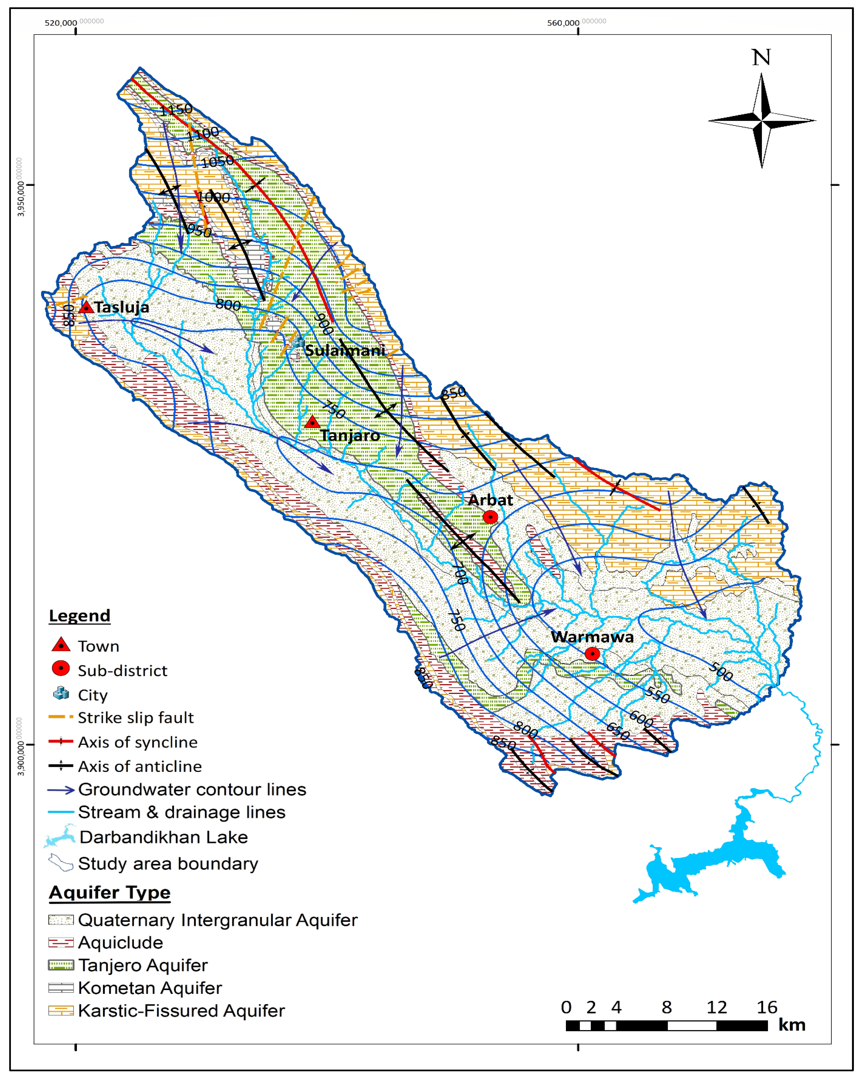 General direction of groundwater flow is from the mountains in the north and northwest towards Sulaimani and the Tanjero River (Figure 3), which later drains into Darbandikhan Lake in the southeast [19].