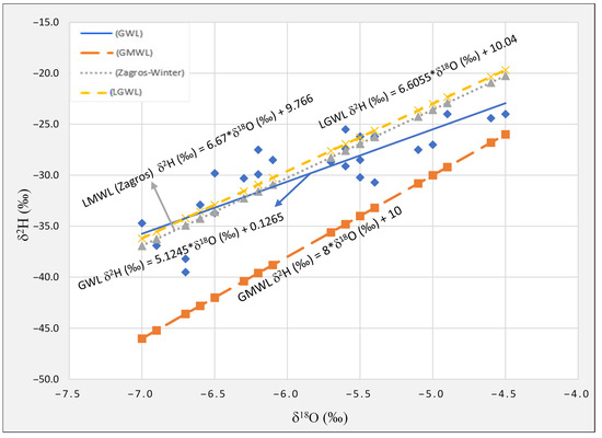 Diagram of δ2H vs. δ18O, LGWL is the groundwater line from previous study [19], LMWL is the local meteoric water line for winter precipitation in Zagros [42], GWL is the local groundwater line for this study, and GMWL is the global meteoric water line (see text for discussion).