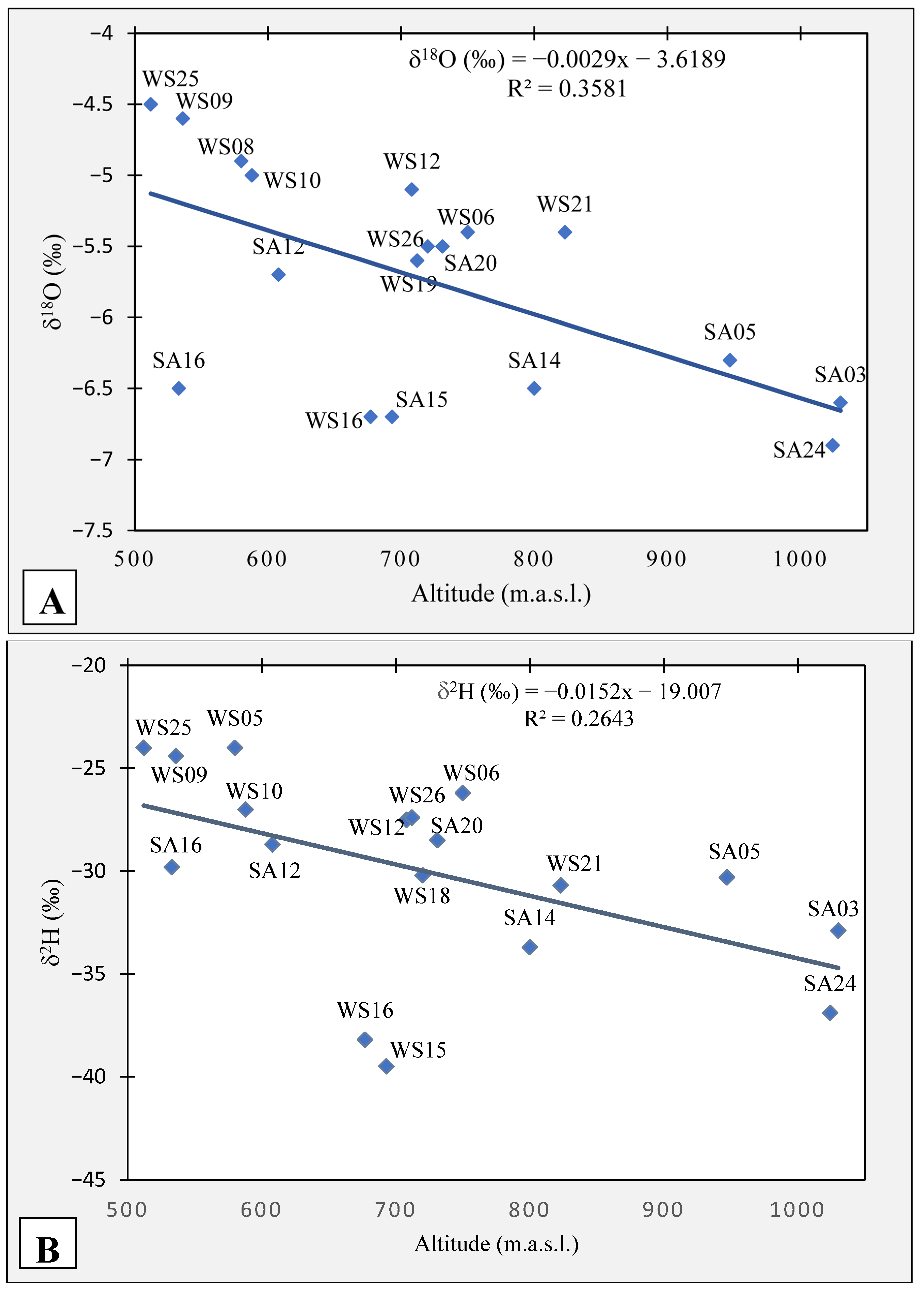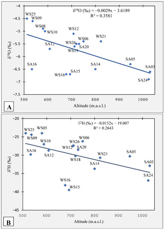The stable isotopes serve as a spatio-temporal tracer, reflecting both relief and time changes [46]. In this regard, the altitude effect was evaluated using the local isotopic gradient (LIG). This was based on the relation between the elevation of the water samples and δ18O and δ2H (Figure 6). The relation shows depletion of δ18O and δ2H in groundwater with altitude, with gradients of −0.29‰ and −1.5‰ per 100 m, respectively, but R2 values are relatively low. The most depleted samples are SA24 and SA03 reflecting the higher altitudes and winter recharge. In contrast, WS25 and WS09 are the least depleted groundwater samples reflecting probably a lower altitude and a warmer period of recharge.