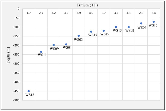 In reference to this, only highly mineralized samples WS14 and WS24 show old age originating before 1950, and the others are a mix of modern and old groundwaters. Sample WS14 is from the Quaternary intergranular aquifer, and WS24 is from the aquitard. Tritium concentrations remain almost constant or decrease slightly with depth down to 125 m (4.9 TU) and then decrease with the depth until they reach the value of 1.7 TU at a depth of 450 m (Figure 7). There are several possible ages of groundwater for most of the groundwater samples, from around 10 years up to at least 40 years old. Groundwater samples that are classified as modern are relatively shallow groundwaters (WS03, WS04, WS15, WS18, and WS22), and they are from an unconfined aquifer. On the other hand, samples from higher depths show older ages, and they are supposed to be from confined aquifers, similar to the finding of [49]. The presence of higher tritium concentration at shallower depths suggests that the groundwater was recharged by recent precipitation compared to the samples which show the mixing with the older groundwater in the deeper parts of the flow system [50].