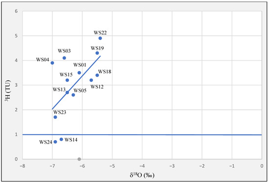 Tritium and δ18O values show only a limited positive correlation in different groundwaters (Figure 10). Enriched waters in terms of δ18O correspond to modern waters with higher concentrations of tritium. The outcropping of the aquifer in some parts of the study area [29,30] may lead to some evaporation of recharged water and its isotopic enrichment [58]. The water samples can be divided into two major groups, Group I: recharged by recent infiltrations of precipitation and group II: recharged in the past. Most measured samples belong to group I, except samples WS14 and WS24 which belong to group II. Sample WS24 is from aquitard and reflects older recharge in limited flow zones [30].