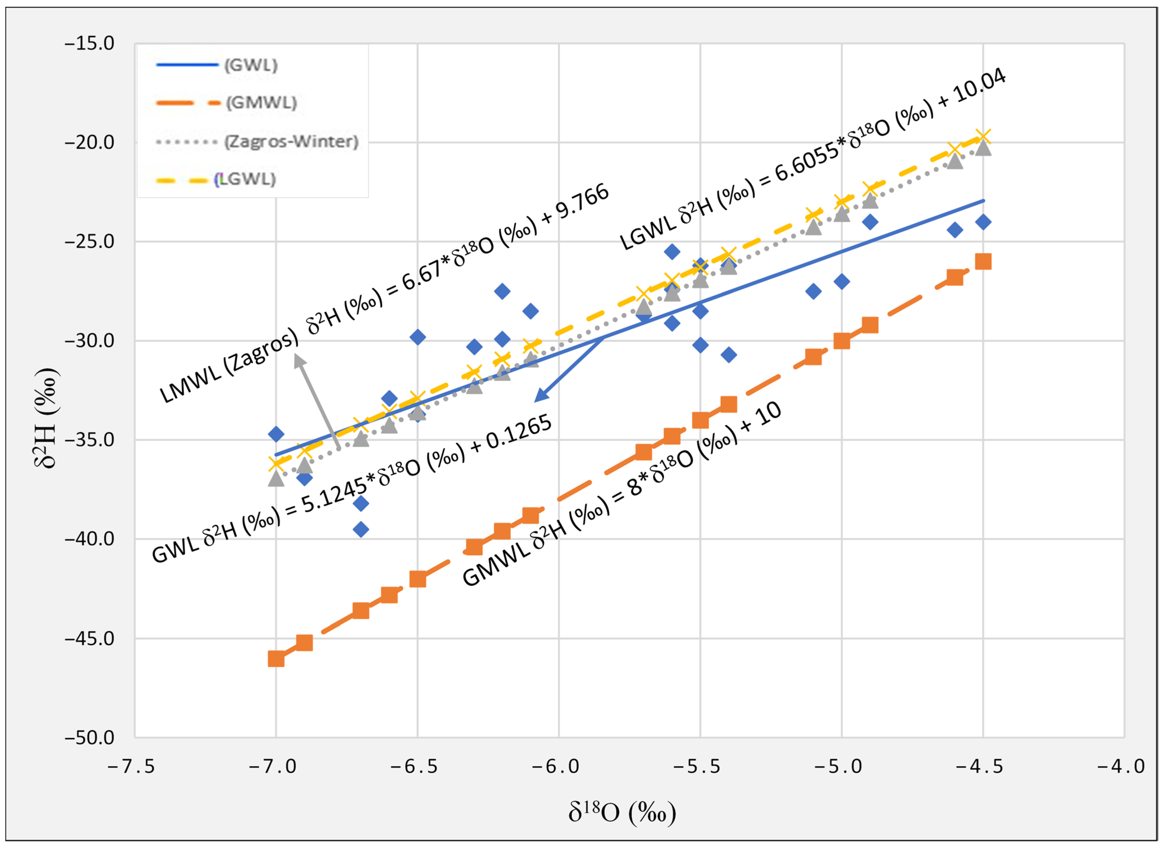 The isotopic composition ranges from −6.7‰ to −4.5‰ for δ18O and from −38.2‰ to −24.0‰ for δ2H in the samples collected around Sulaimani City and the surrounding area. The most positive δ18O value in our dataset is −4.5‰ (Table 4). A previous study reported a more negative value (δ18O = −7.0‰) for a sample collected at the highest altitude (1224 m a.s.l.) in the recharge area, while the most positive value (δ18O = −5.5‰) was found close to Sulaimani [19]. The groundwater line (GWL) for this study is δ2H (‰) = 5.1245*δ18O + 0.1265‰ (Figure 5). This groundwater line also has a lower slope and intercept than the global meteoric water line (GMWL) (Figure 5) and a lower slope than the local groundwater line (LGWL) determined in the previous study, i.e., 5.124 compared to 6.605 [19]. The local GWL for the groundwater samples in the study area also has a lower slope and intercept than the meteoric water lines (LMWLs) for winter precipitation in Zagros, slope 6.67 [42], and yearly LMWL for Zagros with a slope of 6.80 [44]. It might indicate some evaporation impact during infiltration. In relation to the LMWL created by [45] with regression equation δ2H‰ = 7.9*δ18O + 20, in the north of the study area, it can be concluded that precipitation that recharges the aquifers in the study area originates from different vapour masses.