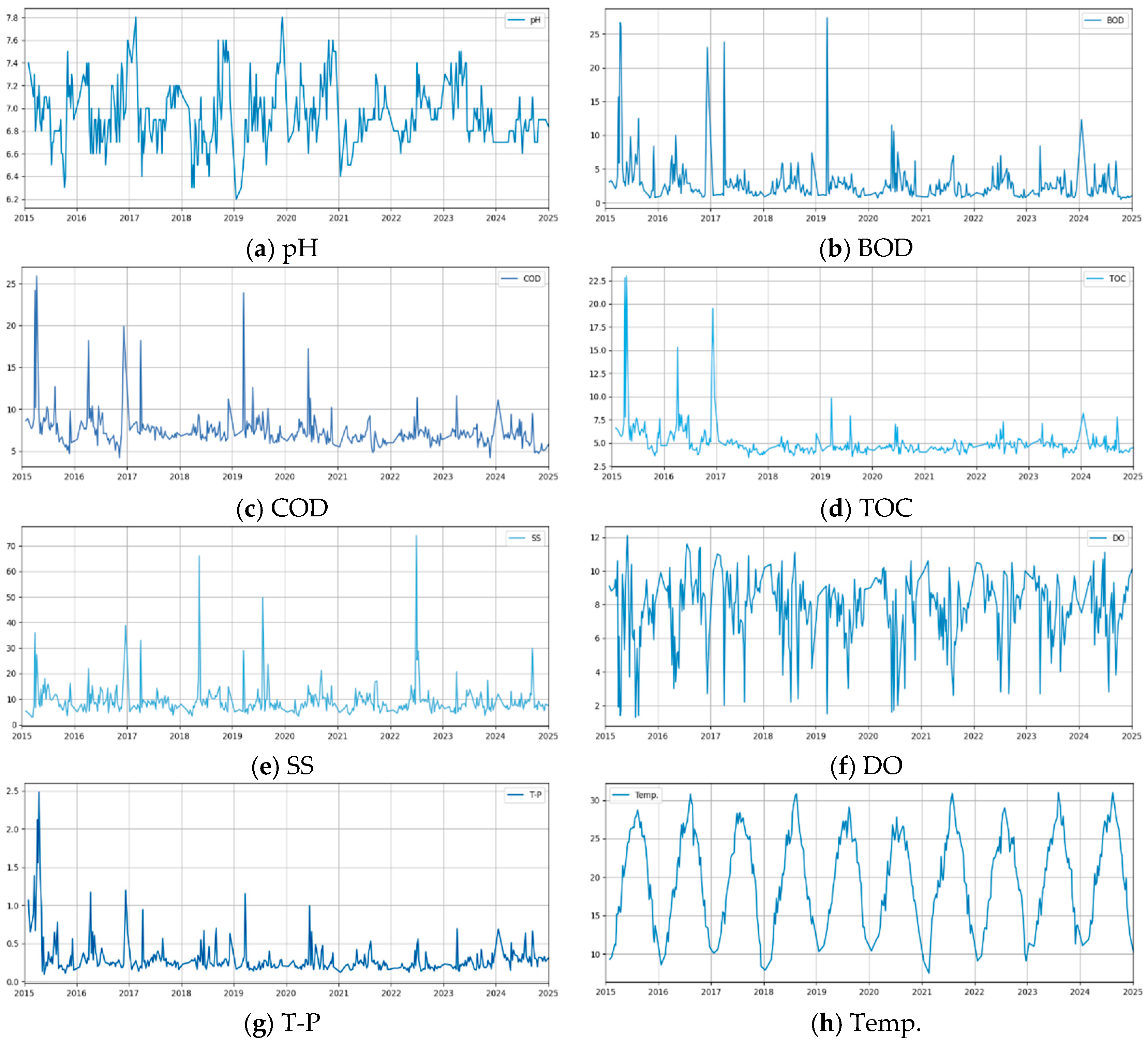- Ju, K.B.; Jung, H.N.; Jang, D.W. Selection of optimal water quality parameters and model for TOC concentration estimation. Crisisonomy 2025, 21, 143–159. [Google Scholar] [CrossRef]