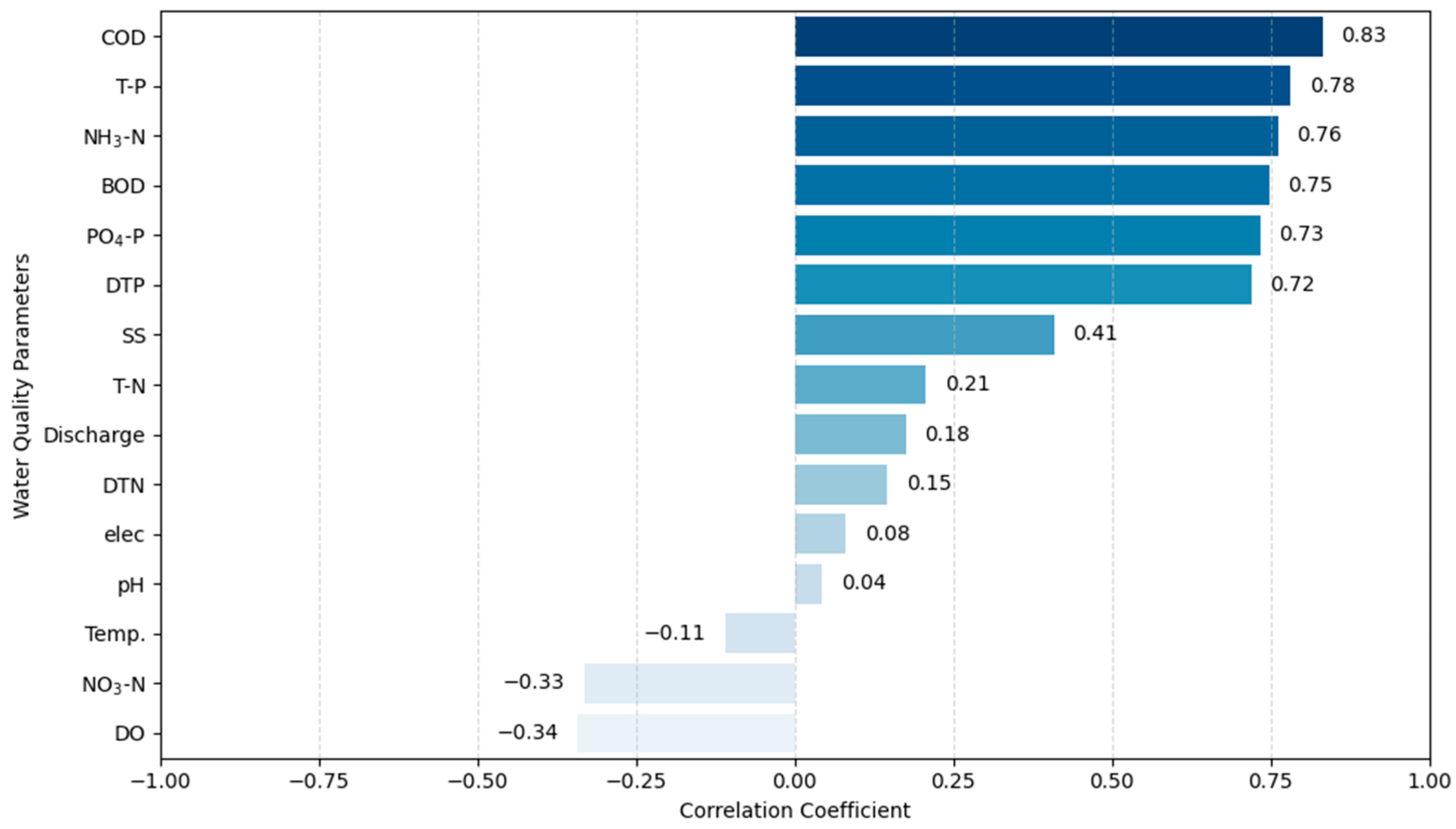 | Pearson correlation | BOD, COD, T-P, NH3-N, PO4-P | 0.6150 | 0.4893 | 0.3752 |