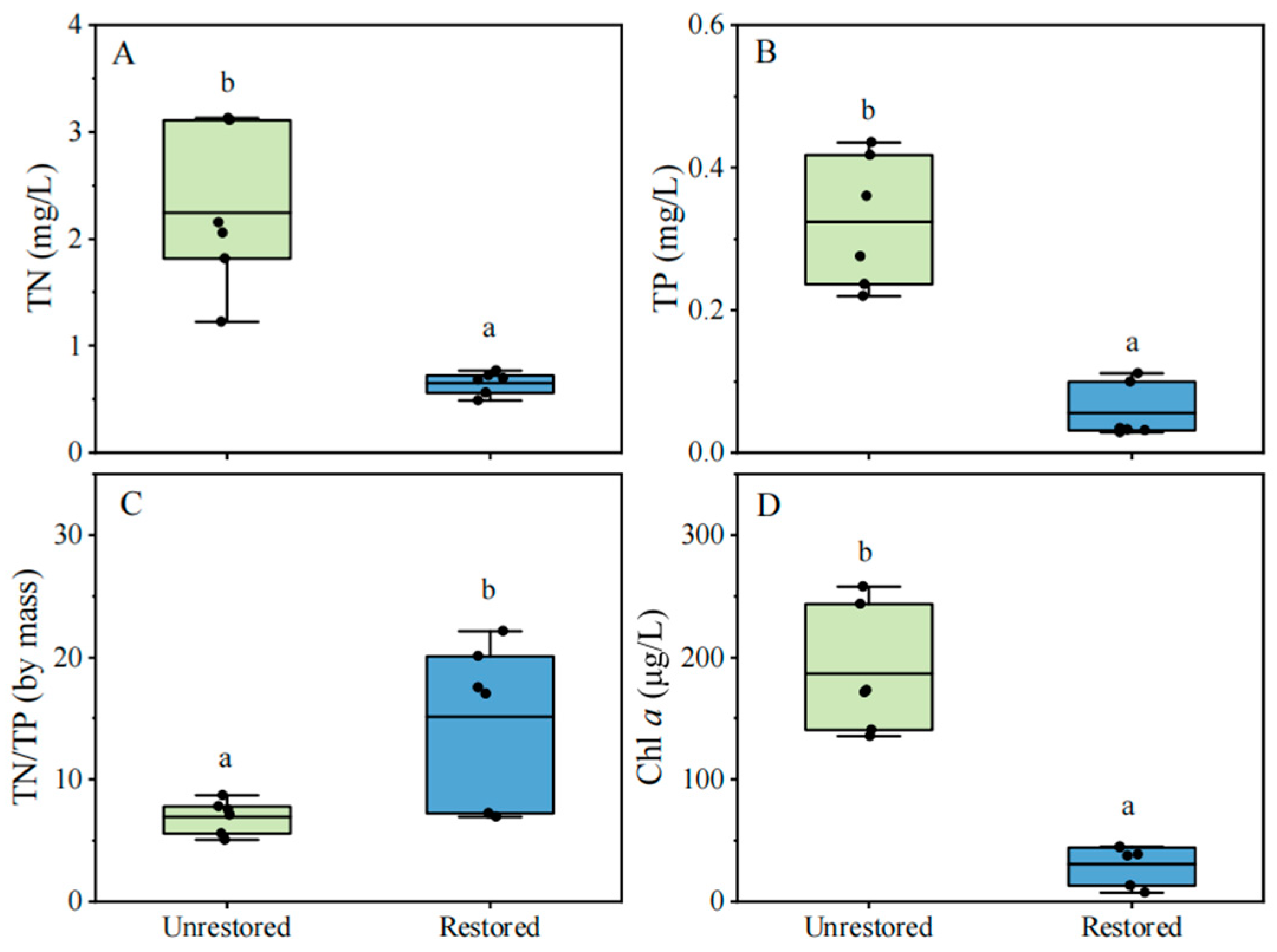 3.1. Nutrient and Chl a Concentrations in the Restored and Unrestored Lake Bay