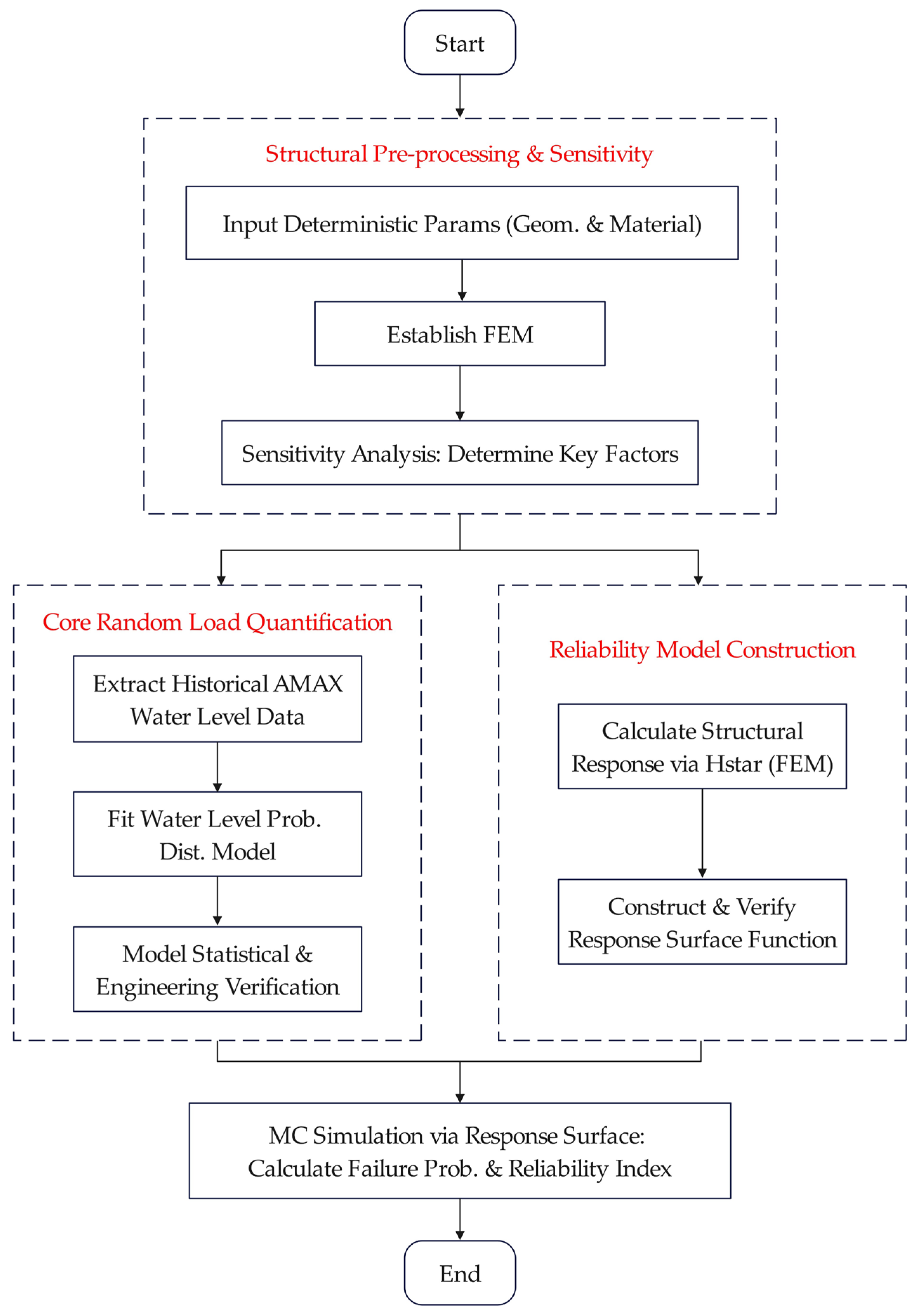This framework uses the historical GEV water level distribution quantified in Section 2 as the core random input, and employs the Response Surface Method and Monte Carlo Simulation from Section 3.2 to efficiently calculate the structural probability of failure under three limit states. This framework tightly couples hydrological analysis with structural reliability analysis, achieving a refined risk assessment based on actual operational loads.