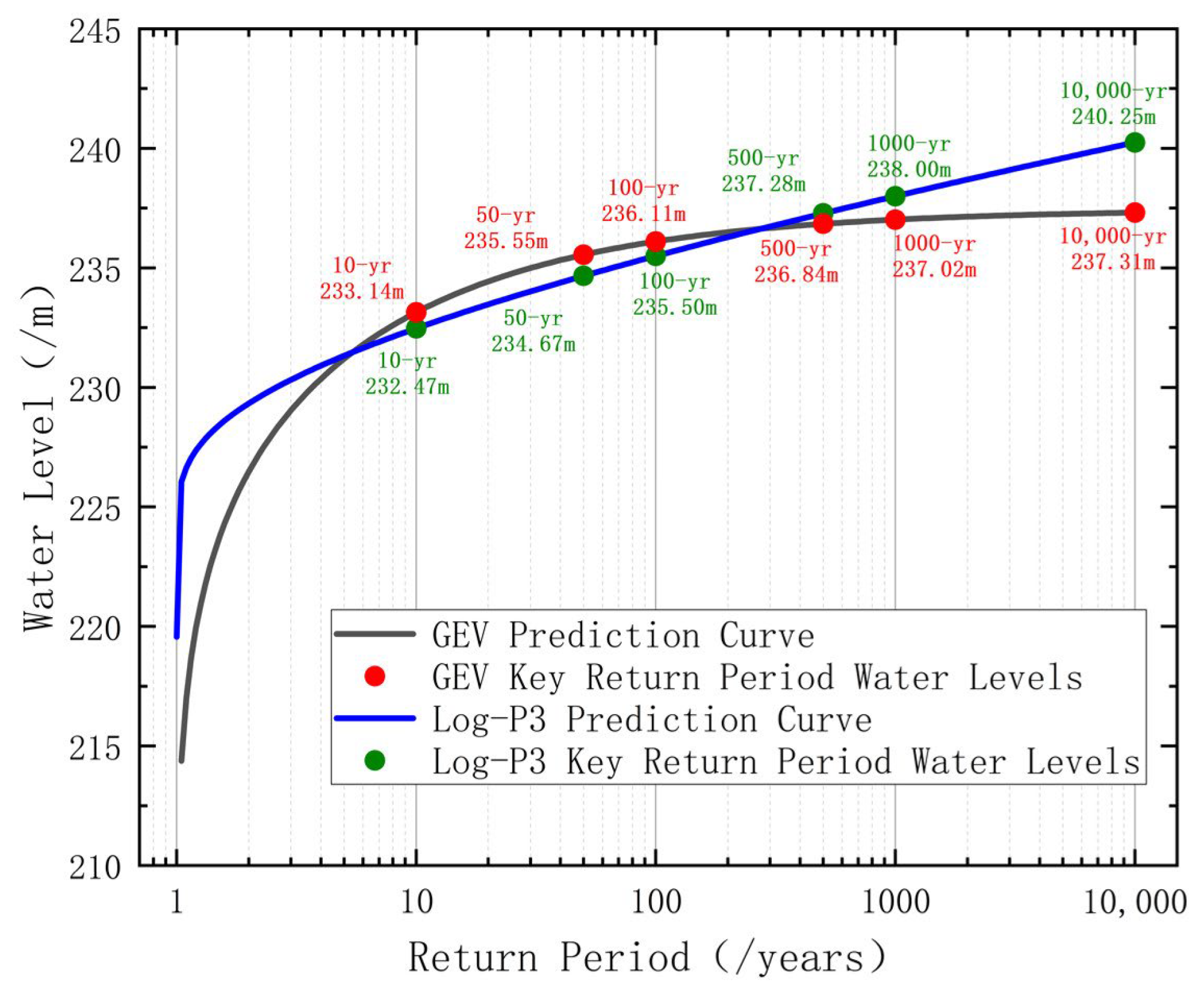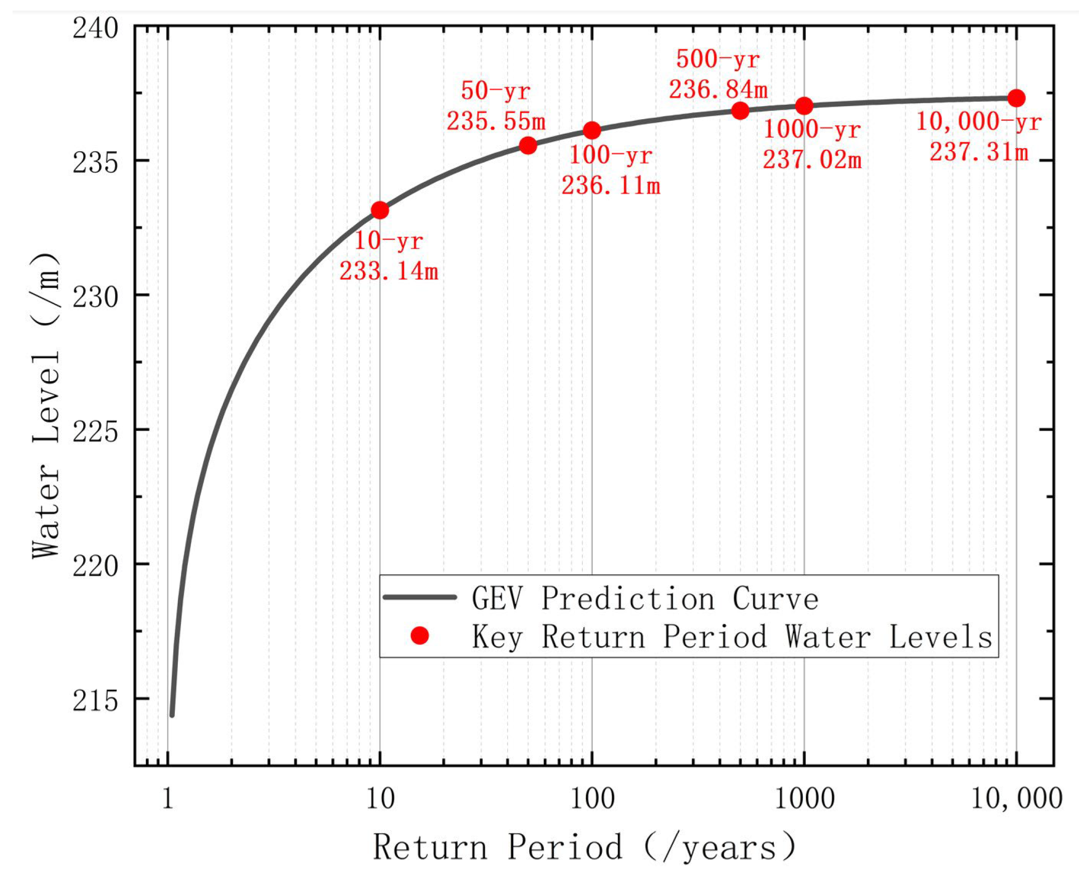 Next, a suitable probability distribution model must be selected and fitted to this dataset. The USBR guidelines recommend common distributions, including the Generalized Extreme Value (GEV) distribution, Log-Pearson Type III distribution, and Gumbel distribution. This paper adopts the Generalized Extreme Value (GEV) distribution, which is primarily determined by three parameters: location μ , scale σ , and shape ξ . The Cumulative Distribution Function (CDF) for GEV is: