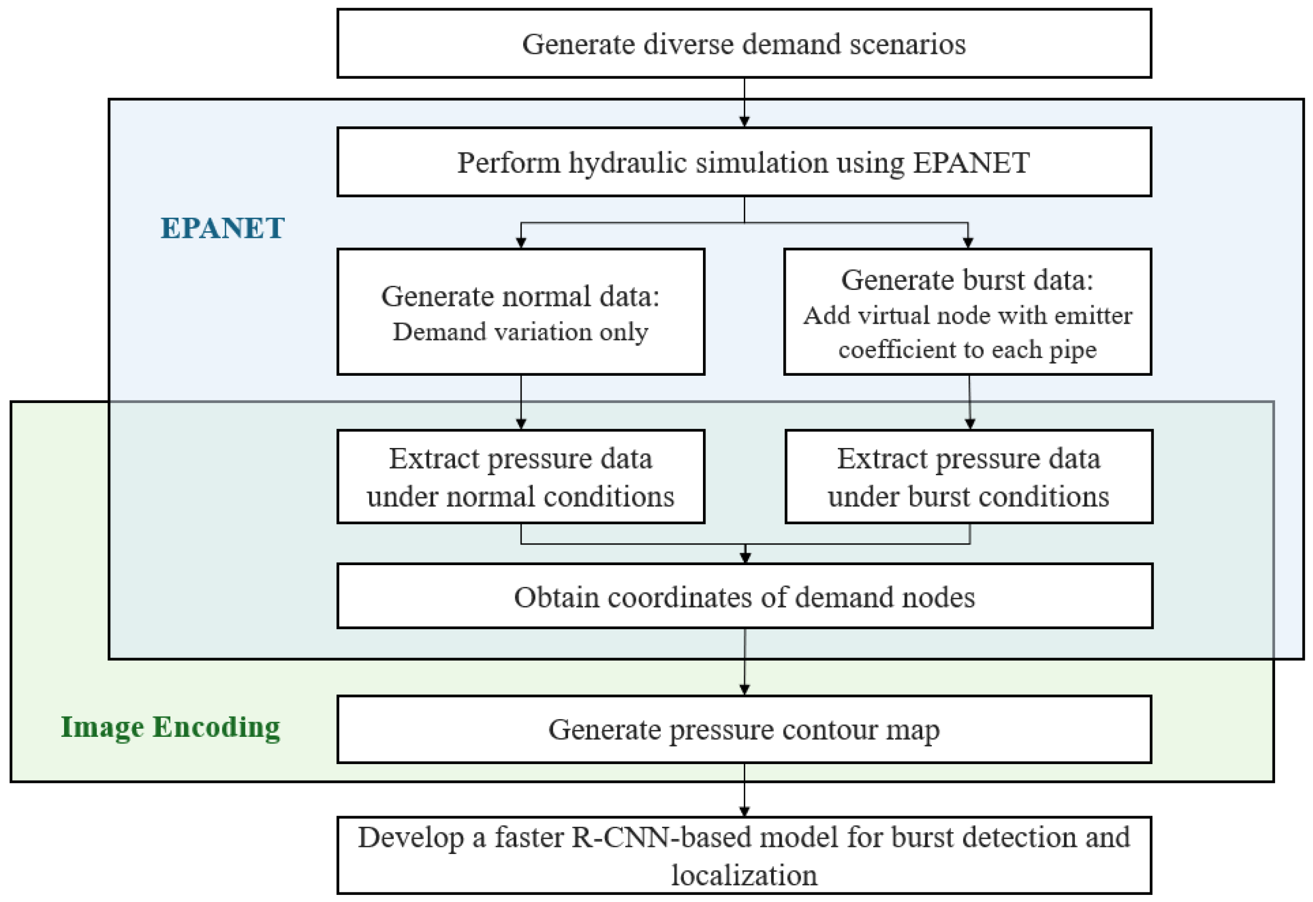 In this study, a novel framework for burst detection and localization in WDNs was developed by integrating hydraulic pressure image encoding with a faster R-CNN-based deep-learning model. The framework was validated on three real-world WDNs (Fossolo, PB23, and CM53) under different sensor coverages (100%, 75%, and 50%).