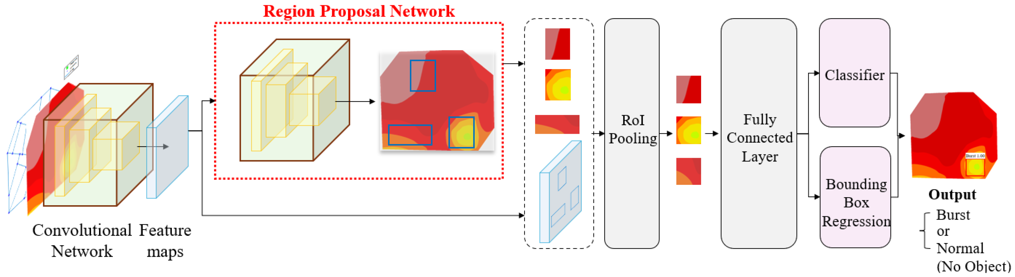 Figure 2. The input to the framework comprised a pressure contour image generated from the hydraulic simulation results, which captured the spatial distribution of nodal pressure across the WDNs. Initially, this image was processed through a series of convolutional layers to extract feature maps that encoded spatial characteristics, such as pressure gradients, abrupt transitions, and localized anomalies. These extracted feature maps were subsequently input into an RPN that scanned the spatial features and generated proposals, with candidate bounding boxes likely to contain burst events. Each proposal was processed through a region of interest pooling layers, which standardized the feature representation to a fixed size, thereby facilitating uniform handling of proposals with varying dimensions. Subsequently, the pooled features were directed to two parallel components: a classifier and a bounding box regressor. The classifier determined whether a given region corresponded to a burst (indicating a pipe failure) or a normal state (indicating no burst), whereas the regressor refined the bounding box coordinates to improve localization accuracy. For training, total images with corresponding PASCAL VOC format annotations were used. Dataset allocations for the testing and training were 20% and 80%, respectively. During the training process, the model was optimized for 10 epochs using a stochastic gradient descent optimizer at a learning rate of 0.005, momentum of 0.9, and weight decay of 0.0005. A batch size of 2 was employed to effectively utilize GPU memory, and data preprocessing included image-to-tensor conversion to ensure compatibility with PyTorch. This end-to-end framework enabled both the detection and spatial localization of pipe bursts using pressure-based visual data, thereby providing a foundation for the automated monitoring of WDNs.