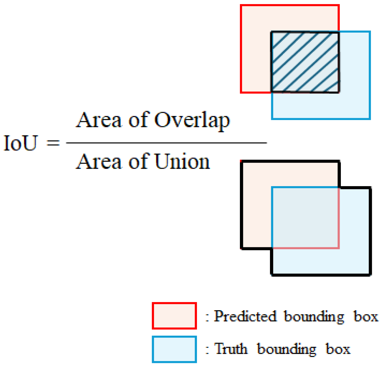 The IoU was used to evaluate the localization accuracy. This metric is defined as the ratio of the overlapping area between the predicted and ground truth bounding boxes to their union area (