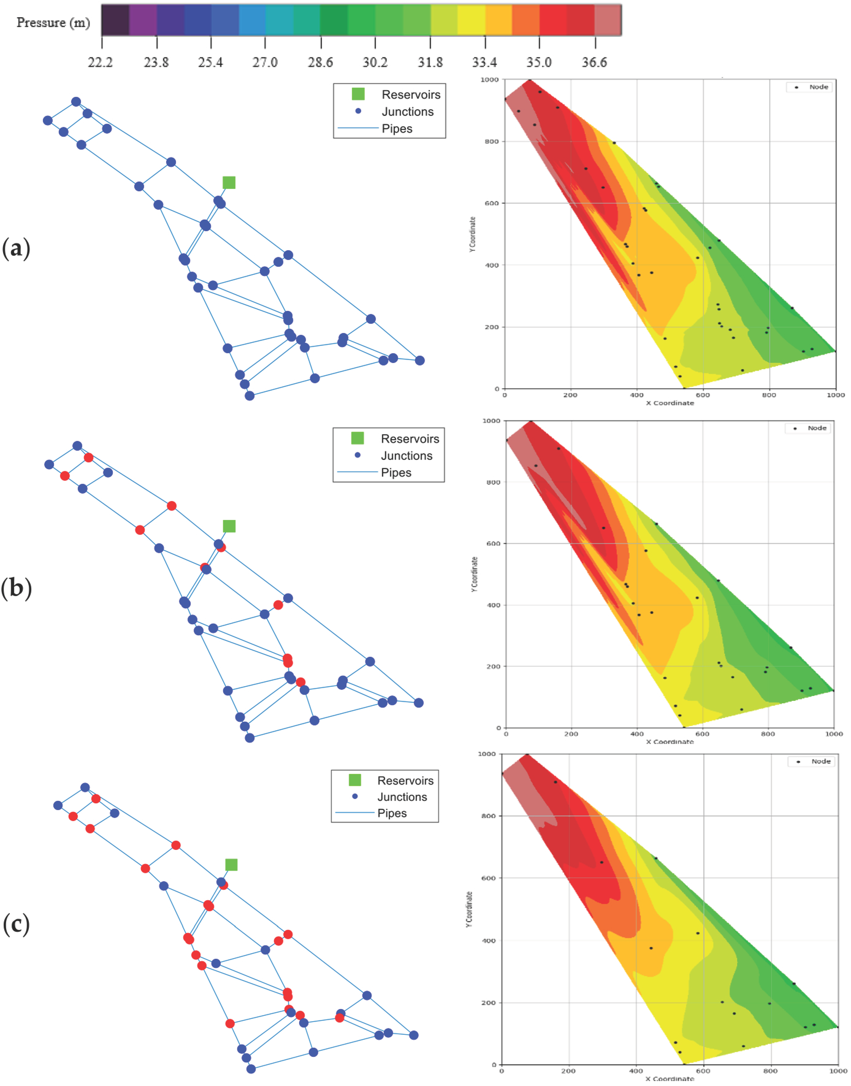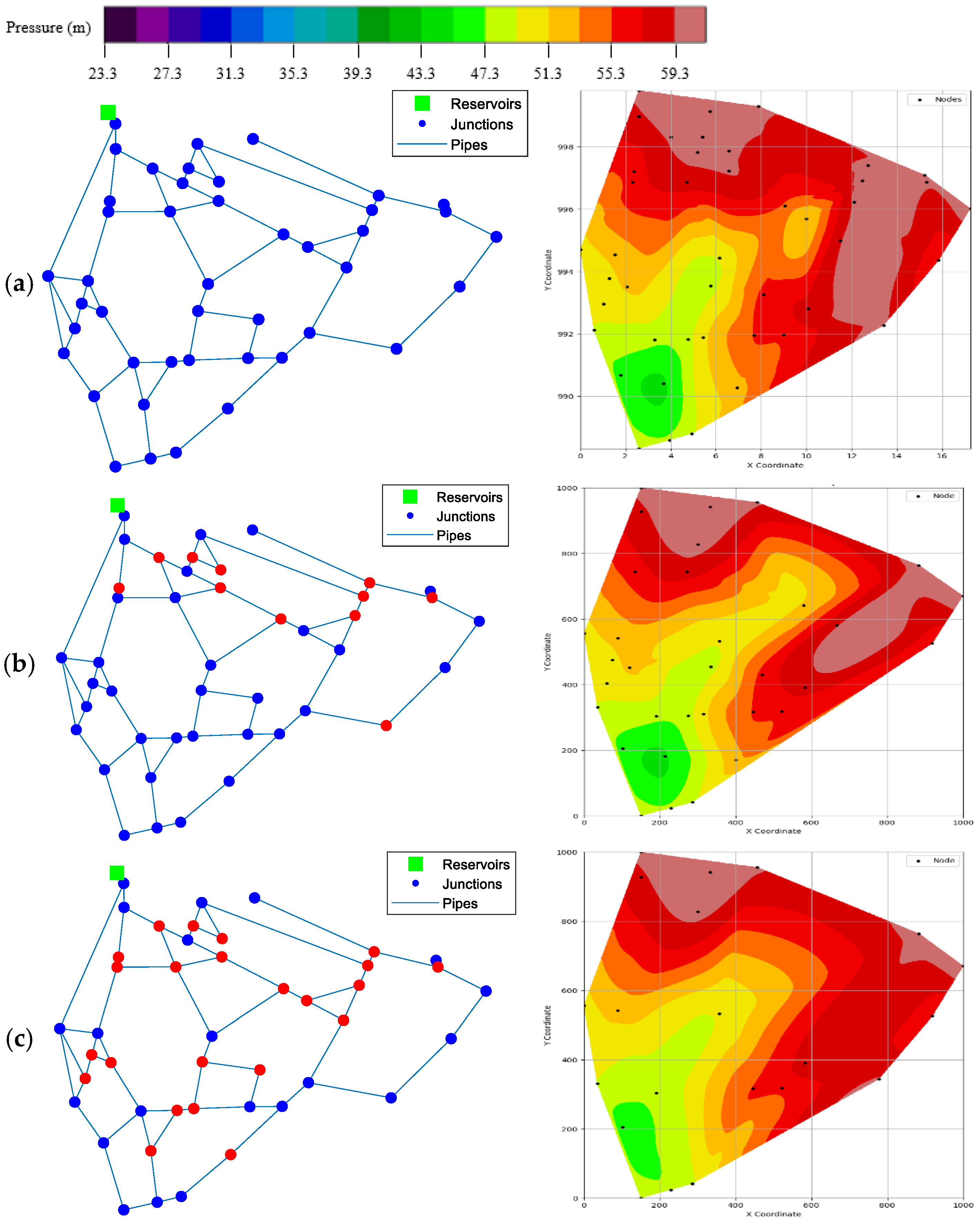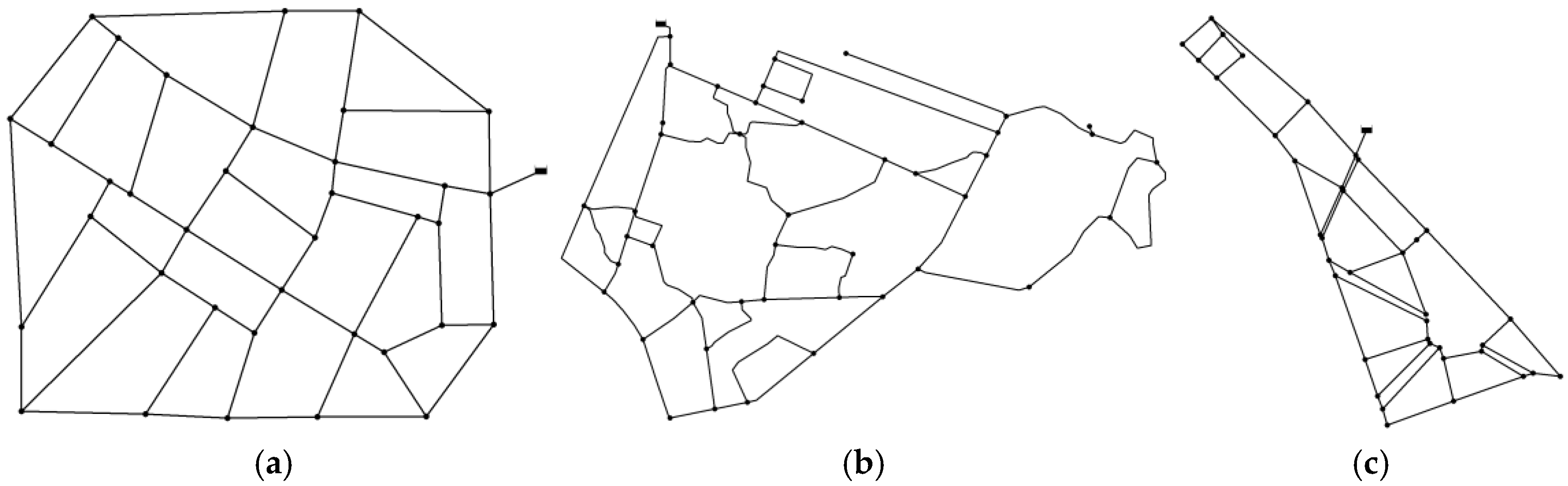 For the burst scenario, pipe bursts were hypothetically simulated. Each pipe within the WDNs was virtually divided at its midpoint, and a fictitious demand node was introduced. An emitter coefficient was assigned to each fictitious node to simulate the burst-flow conditions. The burst scenarios were generated for every pipe in each WDN, meaning that each pipe served as an independent burst location. In this study, the discharge equation for sprinklers introduced by Puchovsky [