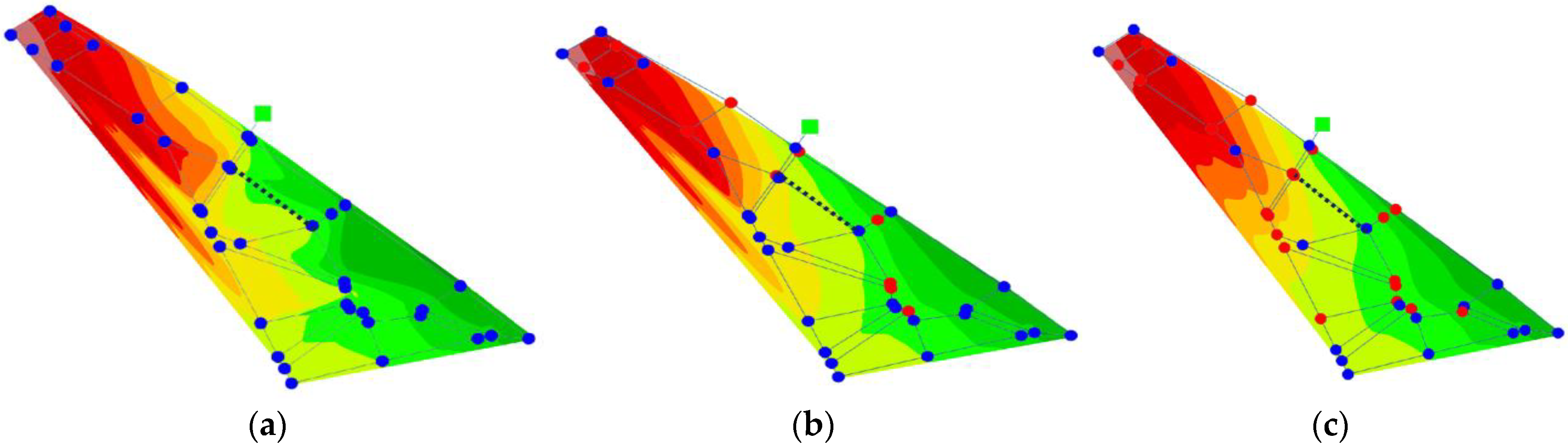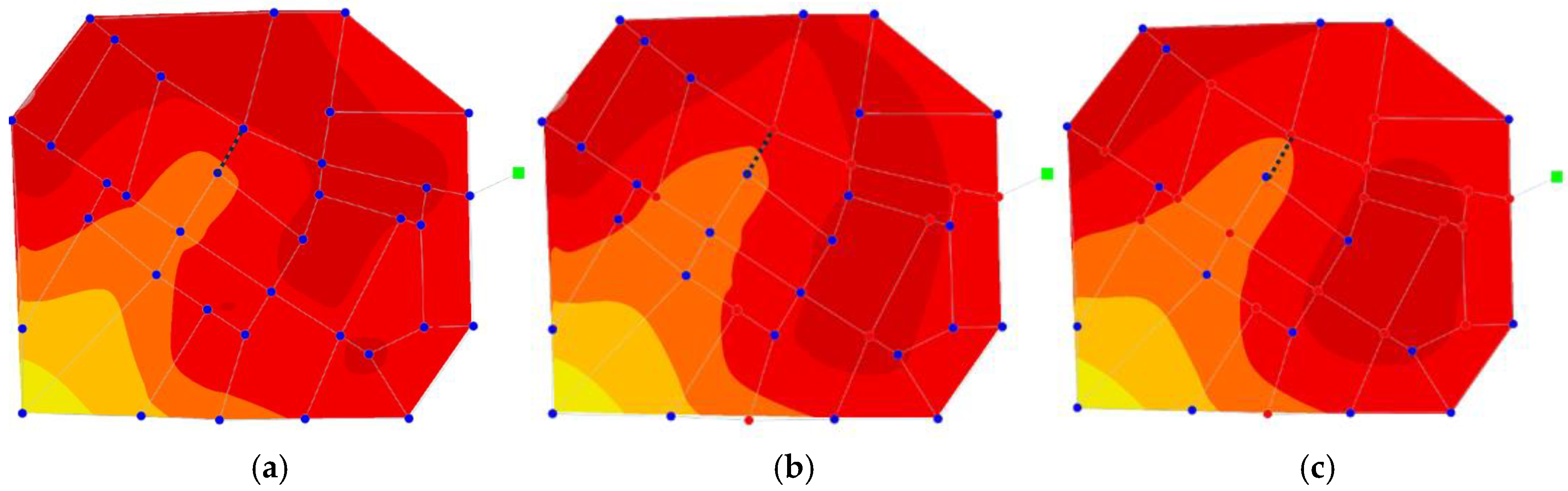 Three levels of pressure sensor deployment (100%, 75%, and 50% of demand nodes) were used to analyze the effect of sensor coverage on burst detection. The 100% scenario corresponds to the idealized case where all demand nodes are monitored, whereas the 75% and 50% cases represent more practical settings with reduced sensor availability. For sensor selection under reduced coverage, a hypothetical burst was simulated at the midpoint of each pipe, and the pressure differences at all demand nodes were computed by comparing preburst and postburst conditions. Nodes that exhibited a residual pressure variation exceeding a threshold of 1.0 m were identified as sensitive nodes for that specific burst event. The repetition of this process for all pipes enabled the enumeration of how frequently each node sensitively responded to burst events. Nodes with higher counts indicate greater sensitivity to abnormal conditions and thus, higher diagnostic value. Accordingly, the top 75% and 50% of demand nodes, ranked by sensitivity count, were designated as sensor locations for the respective coverage scenarios.