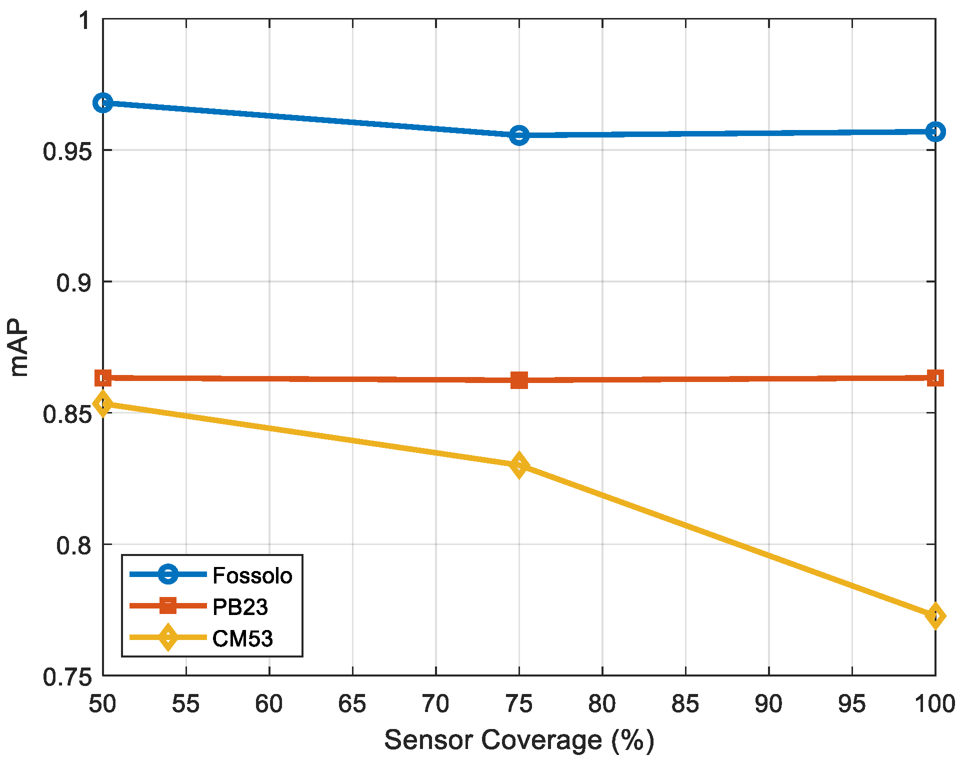 In contrast, for the CM53 network, the model demonstrated an unexpected performance trend: the mAP increased as the sensor coverage decreased (from 0.77 at 100% to 0.85 at 50%). From the PR curves (