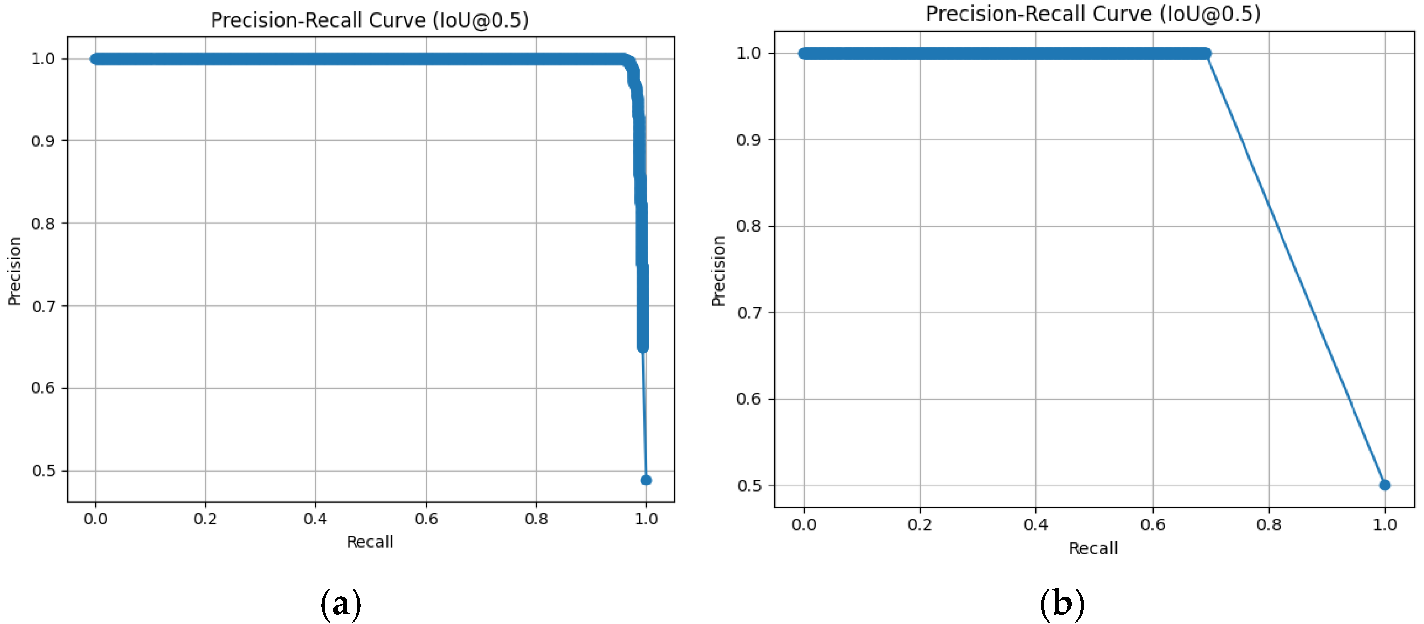 AP, specifically AP@IoU = 0.5, measures the average precision of predictions, where the IoU between the predicted and ground truth bounding boxes is at least 0.5. Initially, all predicted bounding boxes were sorted in descending order of their confidence scores, which represent the certainty of the model regarding the existence of a detected object. For each confidence threshold, predictions are classified as TP if the IoU ≥ 0.5 and the predicted class is accurate; otherwise, they are classified as FP. Cumulative precision (TP/[TP + FP]) and recall (TP/[TP + FN]) were calculated for all thresholds. These metrics were used to generate the precision–recall (PR) curve; the area under the PR curve yielded the AP value for that class. The burst AP and normal AP were calculated separately, focusing exclusively on images that demonstrate burst or normal conditions, respectively. For example, a burst AP of 0.9807 indicates that the model detected burst events with high confidence and spatial accuracy, whereas a normal AP of 0.9653 indicates that the model maintained strong performance in identifying non-burst images. Subsequently, these class-specific AP values were averaged to derive the mean AP (mAP), which provides a comprehensive measure of detection performance across all object classes. A high mAP value implies that the model performed consistently well under both burst and normal conditions.