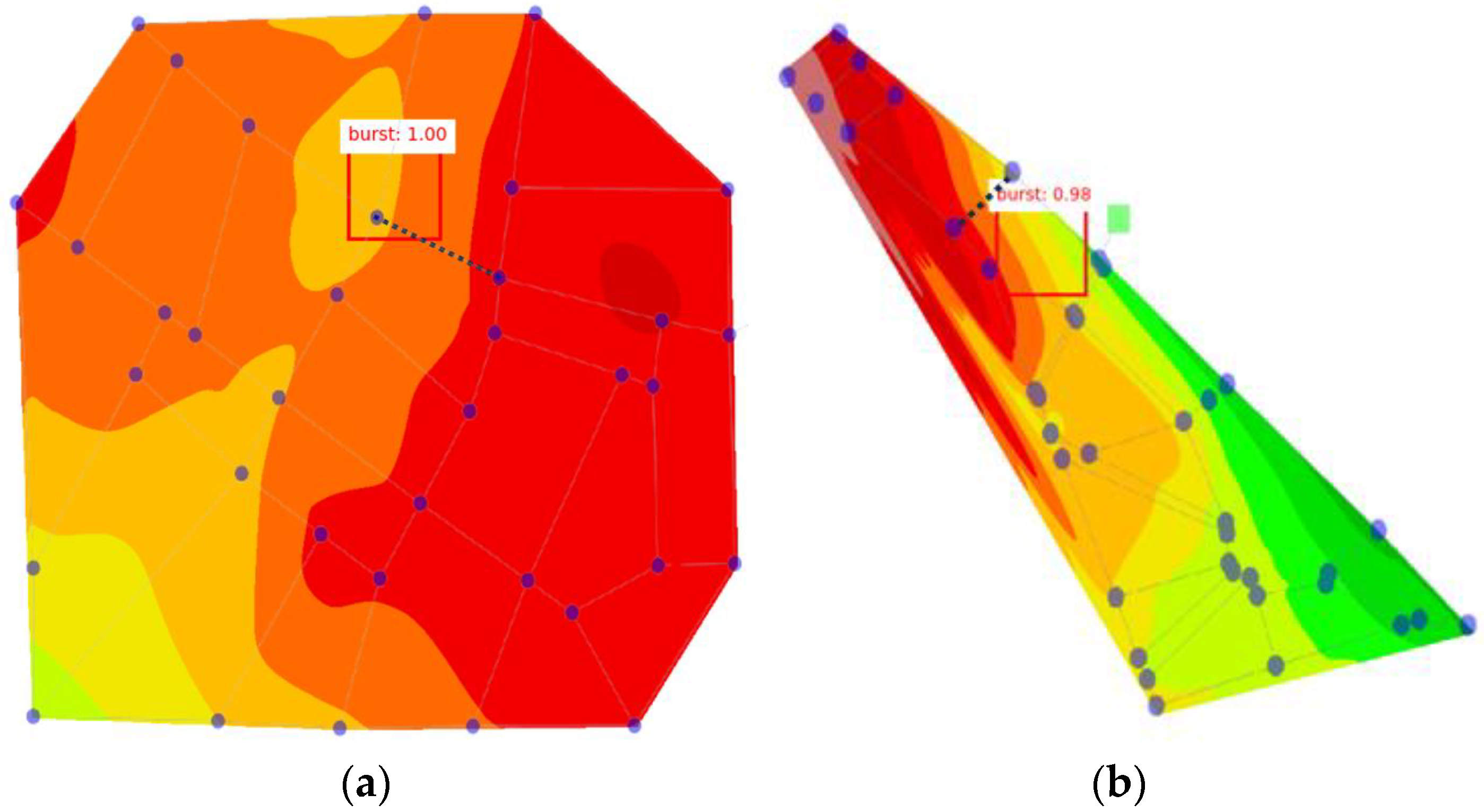 Figure 13b) further corroborated this observation, revealing a misalignment between the predicted and actual burst locations, despite the high confidence scores. These findings suggest overfitting or decreased generalization in highly instrumented and complex networks, such as CM53. The performance of the model improved with reduced sensor coverage, attributed to the elimination of noisy or conflicting features.