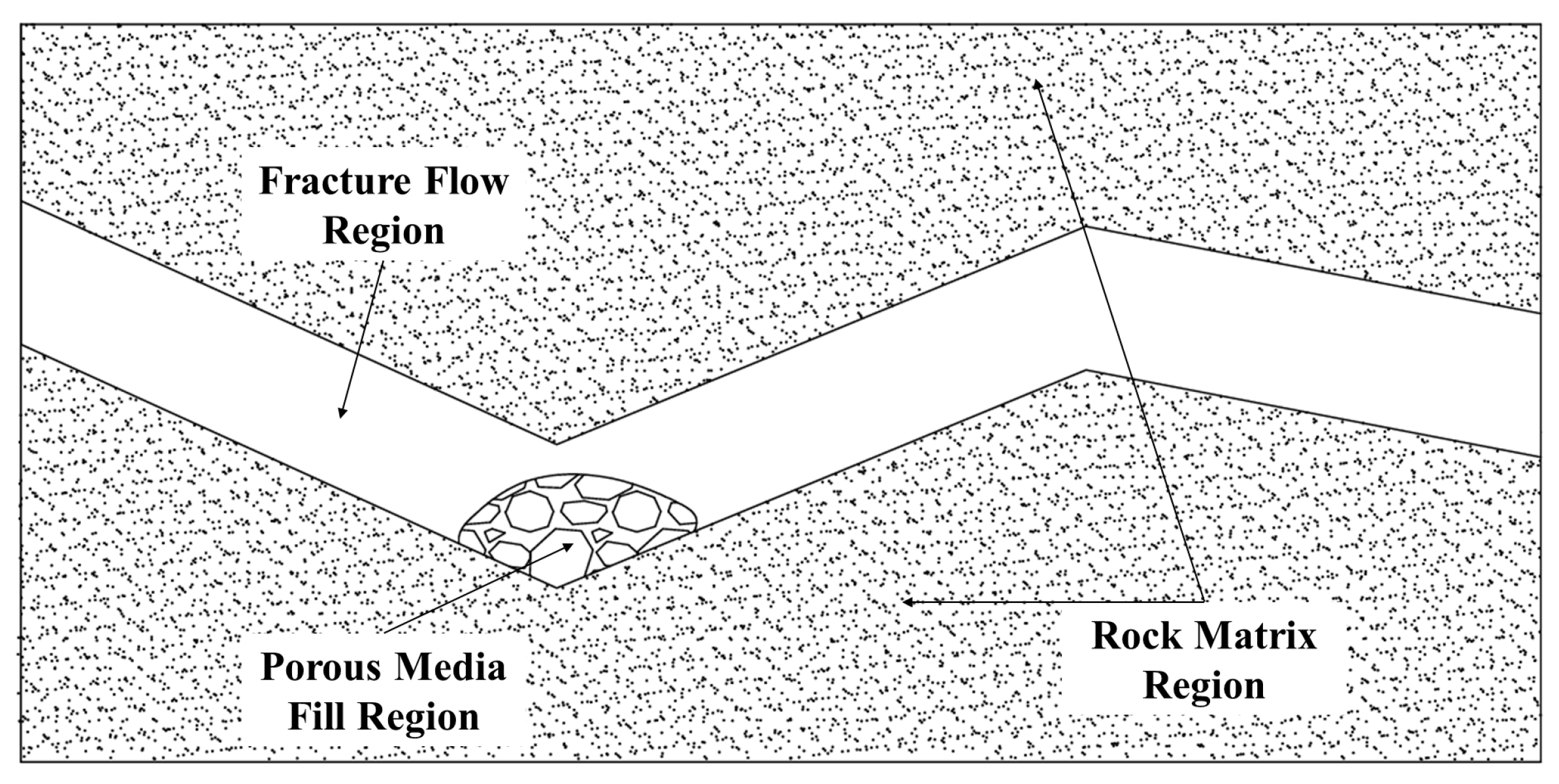 Fractures within the rock matrix serve as conduits for complex, incompressible, and fully developed viscous Newtonian fluid flow. A dual-porosity model for gas seepage proposed by Qin Yueping [26] indicates that the permeability contrast between the porous matrix and the fractures leads to a nonlinear variation in flow distribution ratio. To describe the flow within this system, the domain is partitioned into three interacting physical subdomains (Figure 2): the Fracture Flow Region, which corresponds to unfilled fracture voids where fluid acts as a free stream; the Porous Media Fill Region, which pertains to fracture spaces partially filled with porous media where flow is characterized as matrix seepage; and the Rock Matrix Region, which constitutes the low-permeability rock body surrounding the fractures, where flow likewise occurs as matrix flow.