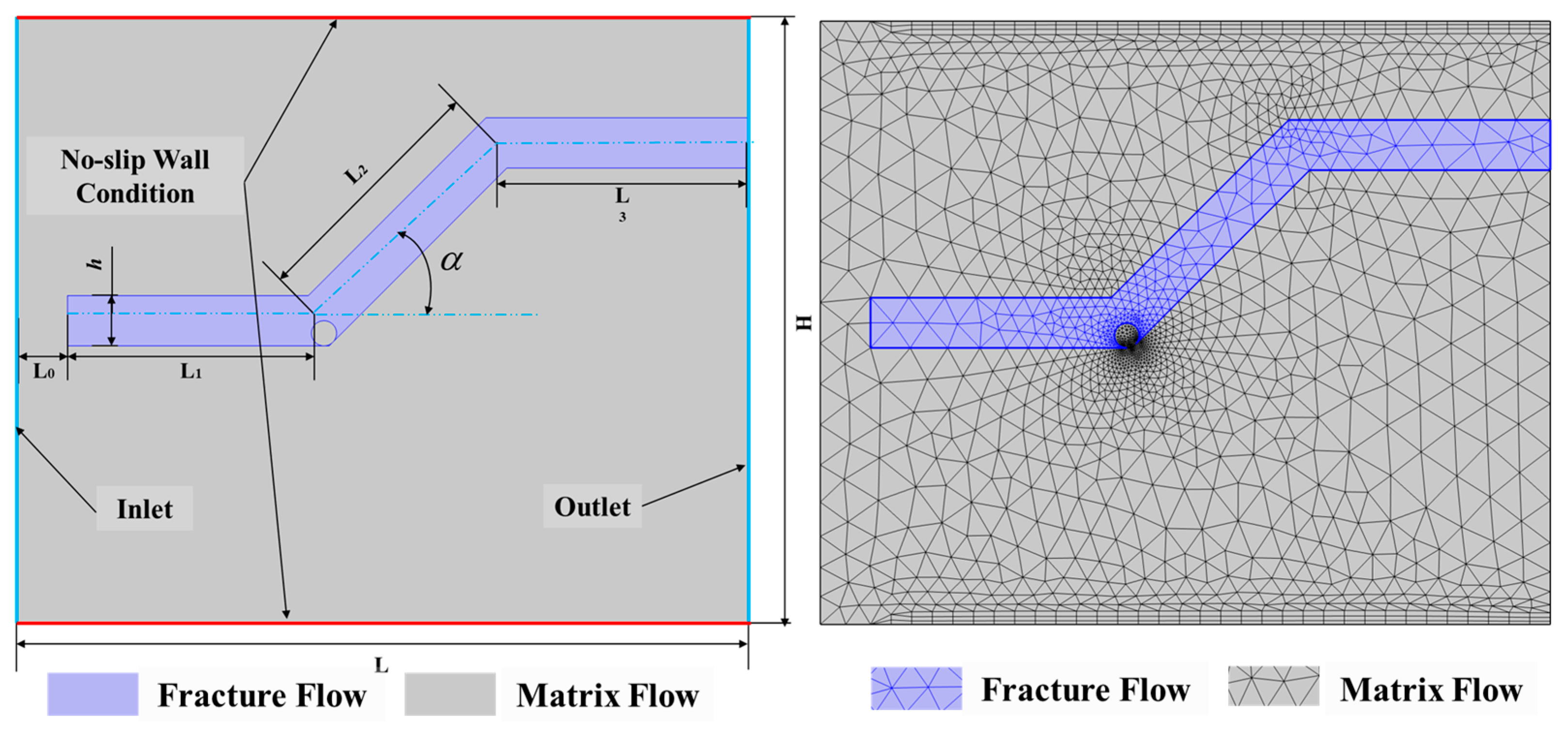 The fluid enters the system from the left porous medium boundary, flows through the partially filled fractures and the rock matrix, and exits through the right fracture boundary and the porous medium outlet. It should be noted that, as the fractures are fully embedded within the porous domain, fluid from the porous medium can seep into the fracture channel through the up-per/lower and left boundaries of the fracture, eventually converging at the right outlet. The tortuous fracture is embedded within the rock matrix and consists of two horizontal segments and one inclined segment. The fracture walls are defined as smooth no-slip boundaries, while the fracture interior is modeled as a homogeneous porous medium characterized by particle diameter (d). The left boundary of the model is connected to an underground water source, while the right boundary serves as the outlet. The rock matrix has a height H and width S. The three fracture segments have lengths L1, L2, and L3, respectively, with a uniform aperture ‘h’. The fracture tortuosity of the inclined fracture is α. A standardized meshing strategy was implemented to balance computational accuracy and efficiency. The fluid was assumed to be a single-phase, incompressible, laminar flow. The numerical model was constructed at a millimeter geometric scale, and the permeability of the porous medium was considered isotropic.