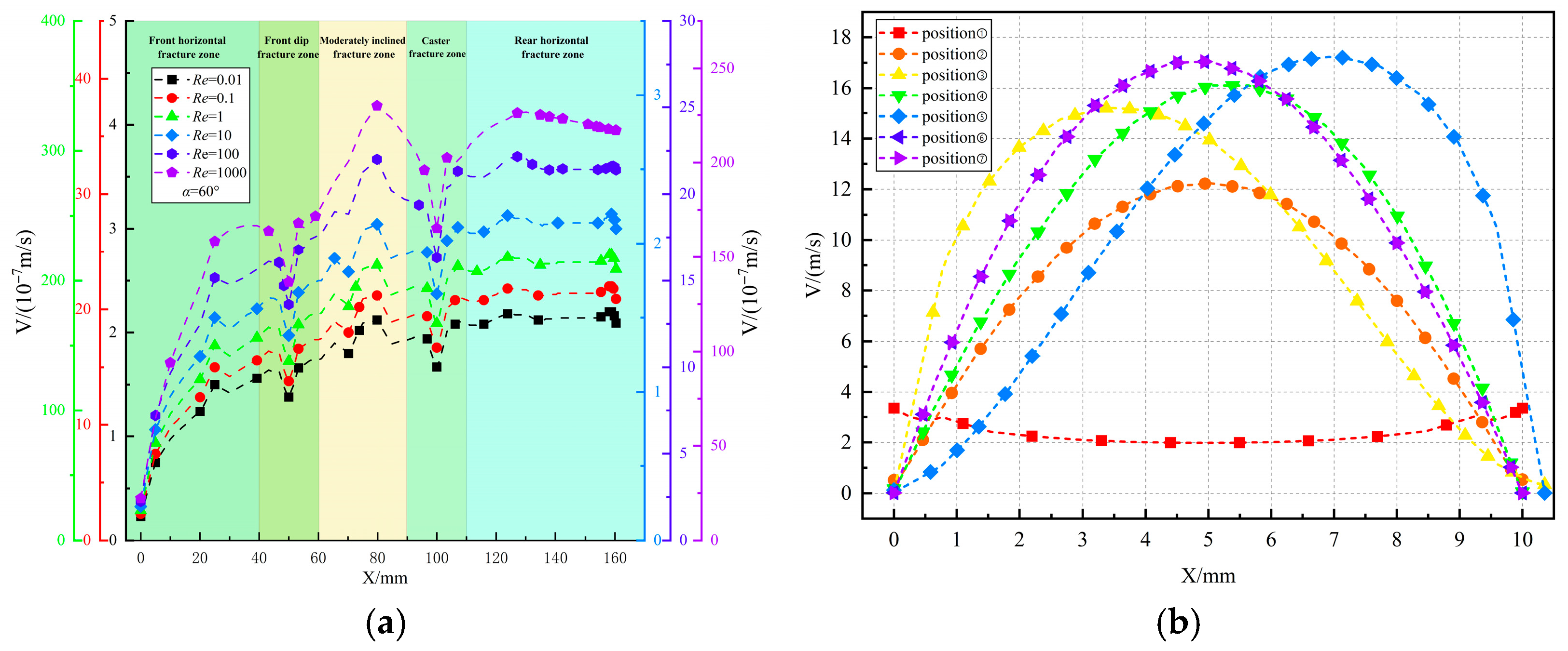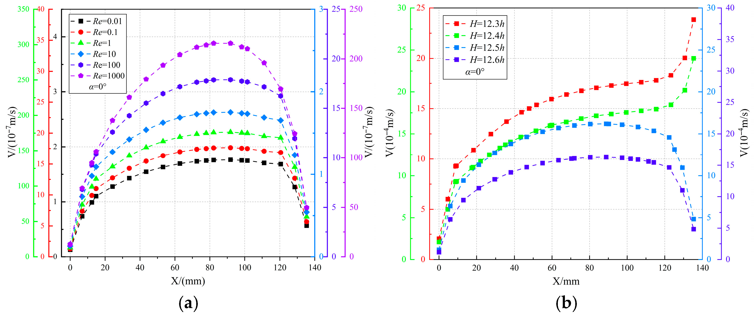 Figure 6. Horizontal fissures flow velocity distributions with Re. (a) Re = 10−2–10−2; (b) H = 12.3–12.6 h.