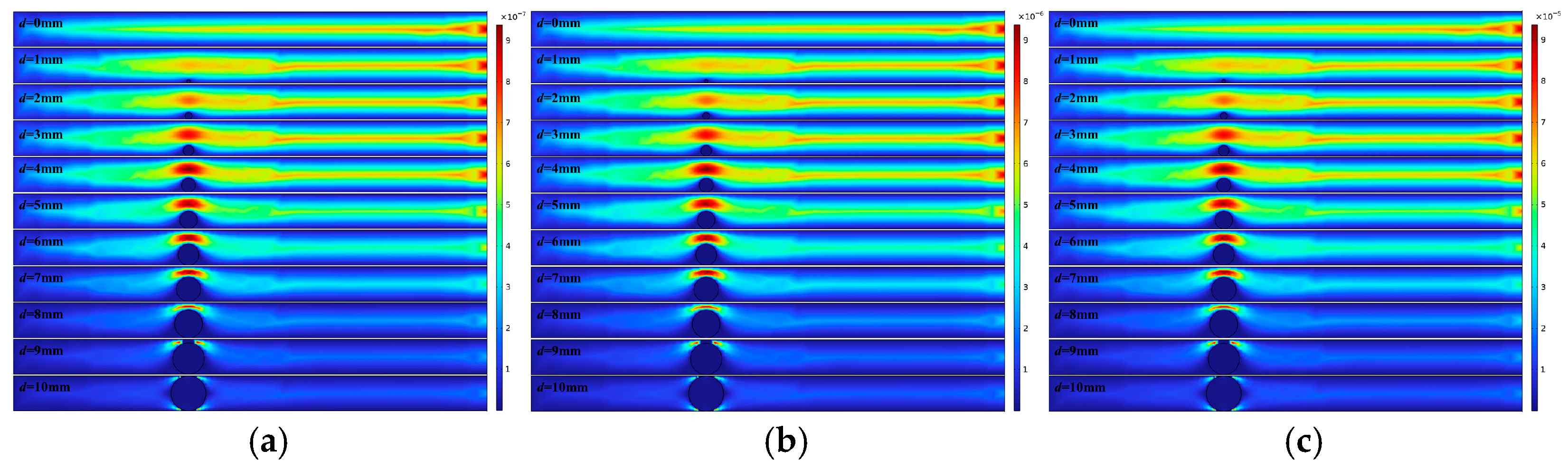 As shown in Figure 7a, when the horizontal fracture contains no porous infill (d = 0), the fluid velocity increases continuously along the flow direction, and the area of high velocity gradually expands, reaching its maximum velocity and spatial extent at the fracture outlet. The flow path is clear, the flow pattern is relatively stable, and it exhibits a regular morphological structure. With small infill diameters (d = 1–3 mm), local acceleration zones form around the infill material. The high-velocity zone expands upwards, and the velocity peak remains located at the fracture outlet. As the infill diameter increases (d = 4–7 mm), its obstructive effect on the fracture flow becomes more pronounced. The fluid flow channel gradually narrows, the outlet velocity decreases, the extent of the high-velocity region shrinks and shifts above the infill material. The peak velocity occurs over the infill material. When the infill size nearly blocks the fracture (d = 8–10 mm) [14], the flow path is obstructed. Fluid on the left side of the infill must slowly permeate through the porous infill material to enter the right side of the fracture. The maximum flow velocity occurs at the narrowest constriction between the fracture and the infill material.