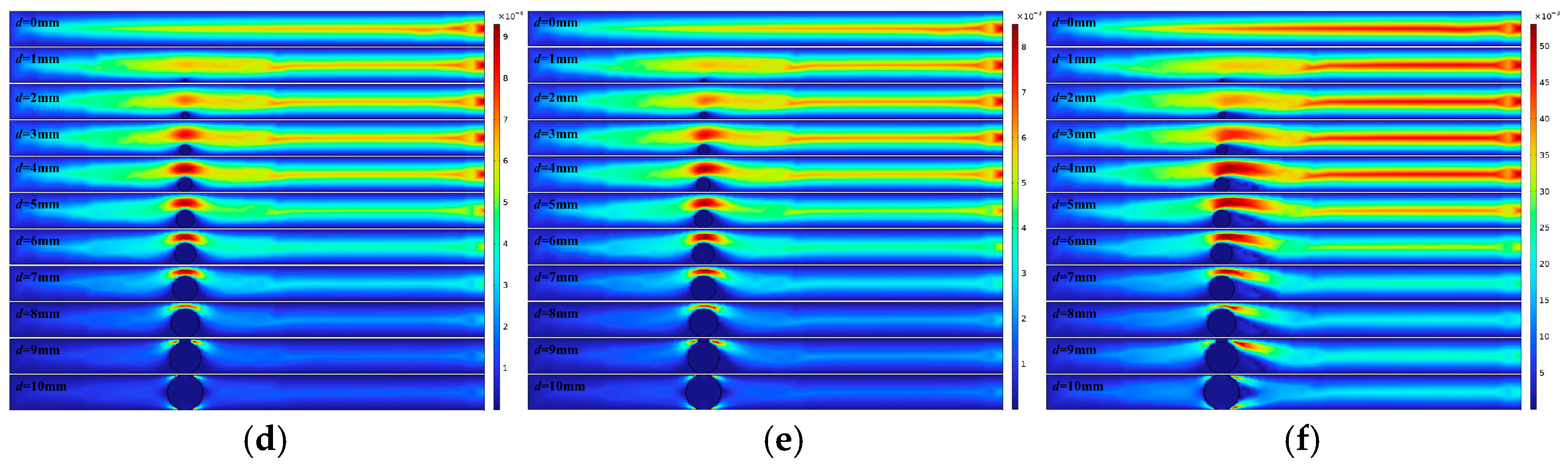 Figure 11g–l (d = 4–10 mm) depict a completely blocked flow regime. The infill material forcibly reconstructs the flow path, forming narrow, high-velocity bypass channels. The velocity distribution becomes highly asymmetric, with significantly reduced velocity in the central region. Boundary layer separation intensifies, generating large-scale, high-energy vortex regions. The flow morphology approaches turbulent characteristics, with energy dissipation dominated by inertial collisions and vortices.