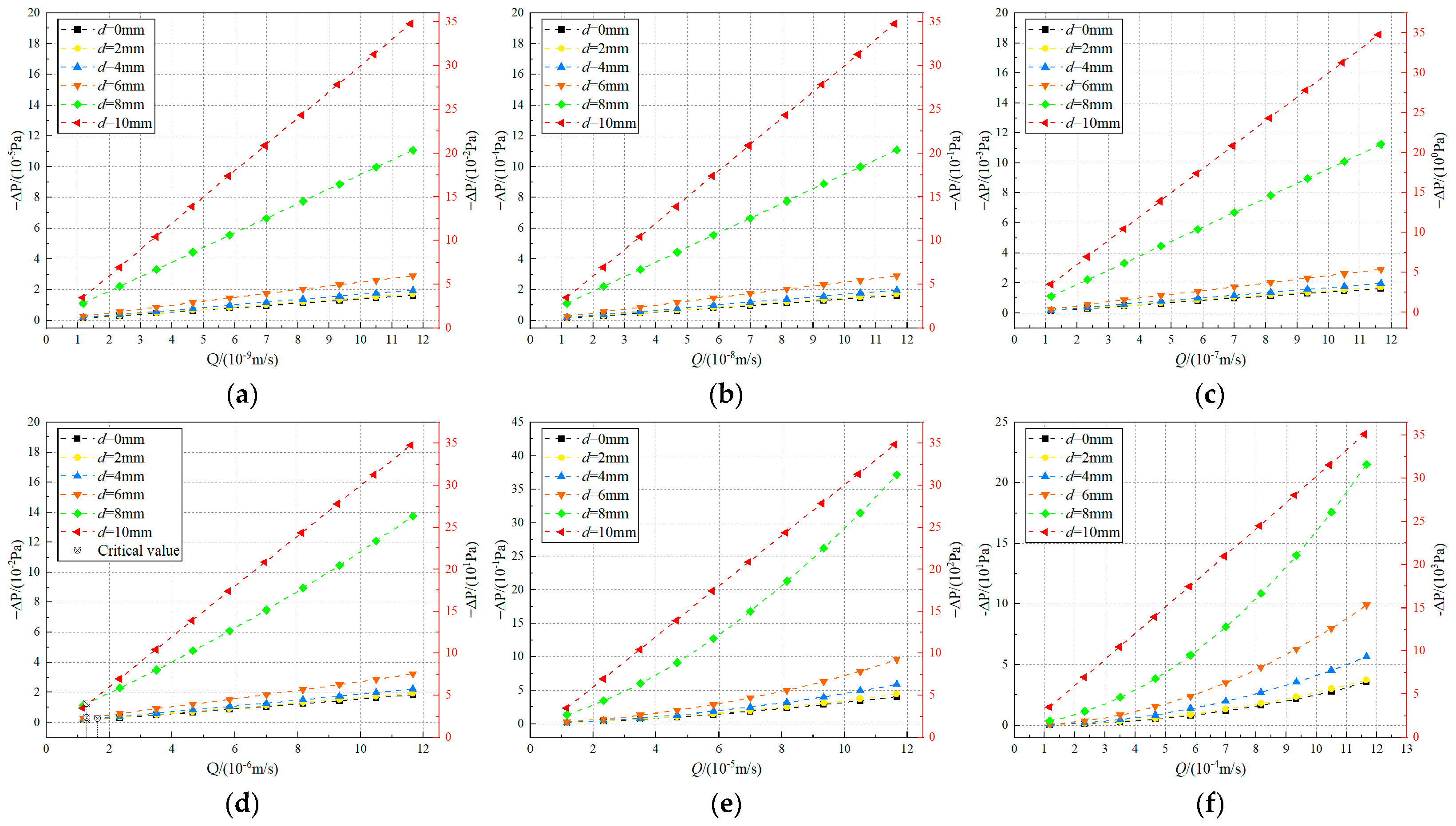 Figure 8. Pressure drop-flow rate curves under different particle diameter (d) and Reynolds number (Re). (a) Re = 10−2–10−1; (b) Re = 10−1–100; (c) Re = 100–101; (d) Re = 101–102; (e) Re = 102–103; (f) Re > 104.