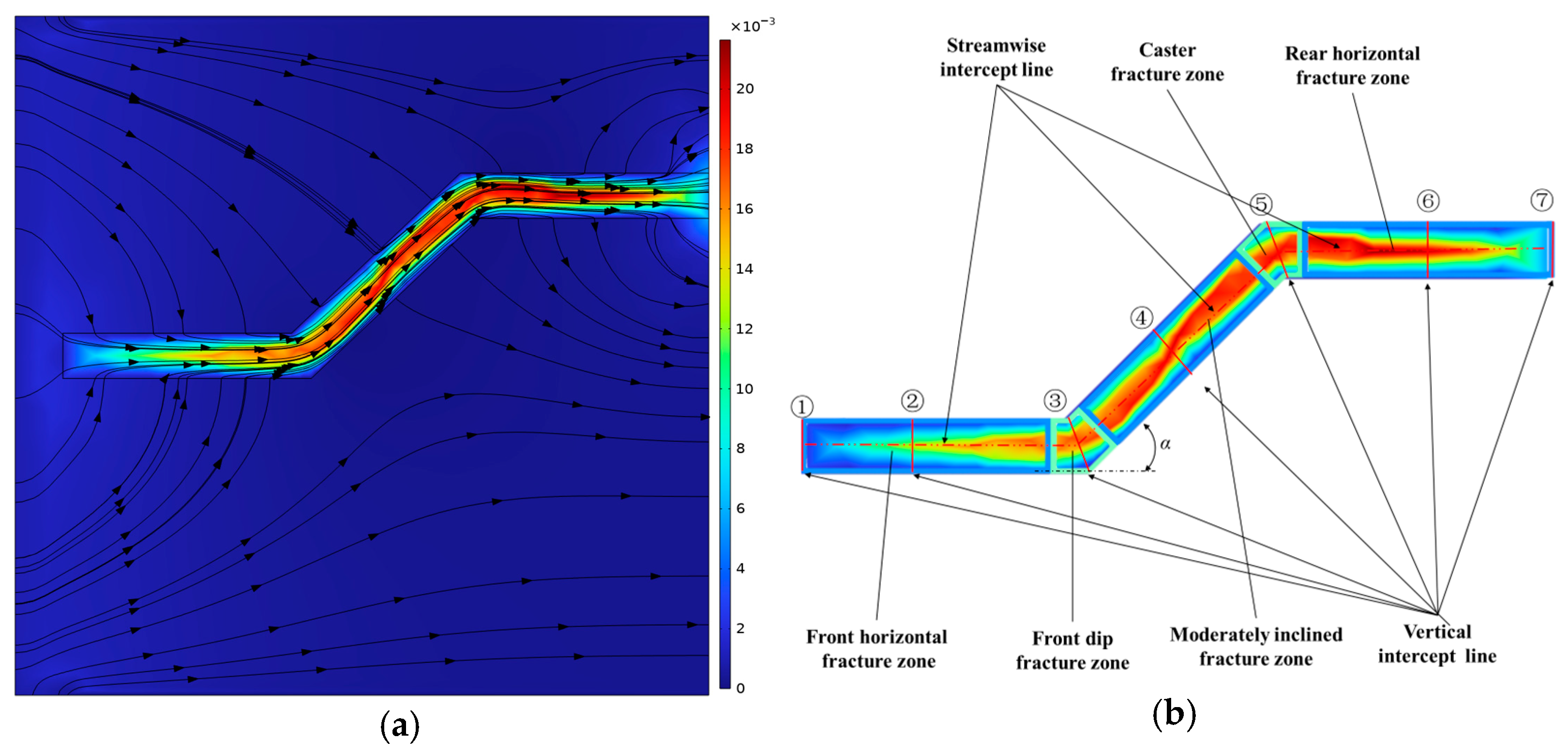 As shown in Figure 9a, the flow velocity increases most rapidly in the front horizontal fracture zone. The velocity is significantly lower in the front and rear dip-angle fracture zones compared to the adjacent zones. The central inclined fracture zone and the rear horizontal fracture zone exhibit a trend of initial velocity increase followed by a decrease. These results are consistent with the velocity and streamline distributions shown in Figure 10a.This phenomenon occurs because fluid flow within the fracture is influenced by the shape and size of the inclined fracture and its hydrodynamic characteristics. Local vortices form as fluid passes through the fracture regions. The fluid streamlines follow an asymmetric parabolic distribution along the fracture path, with the peak velocity located near the upper fracture wall. Consequently, the primary flow path in the front and rear dip-angle zones does not coincide with the defined cross-sectional line, leading to abrupt velocity gradient changes and resulting in lower measured velocities in these regions. The velocity decrease in the rear horizontal fracture zone is consistent with the mechanism described earlier for the horizontal fracture model.