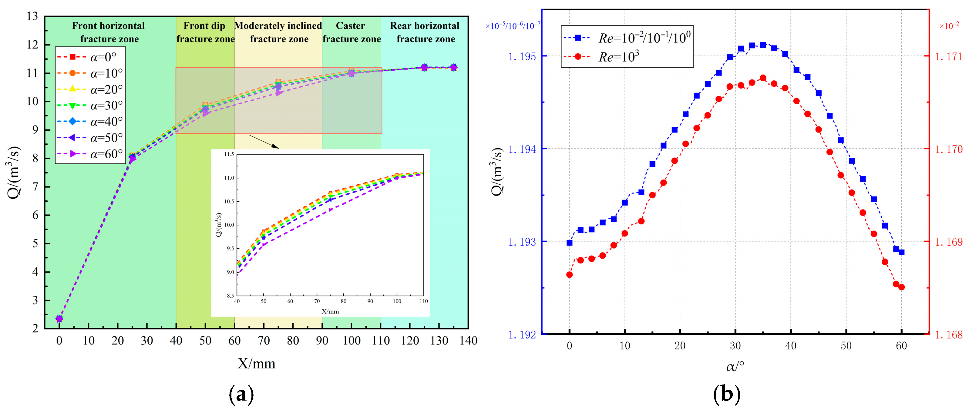 Figure 12. Volumetric flow rate (Q) distribution along tortuous fractures under different dip angles and monitoring locations and volumetric flow rate (Q) of tortuous fractures under different dip angles and Reynolds numbers. (a) different dip angles and locations; (b) different dip angles and Re.