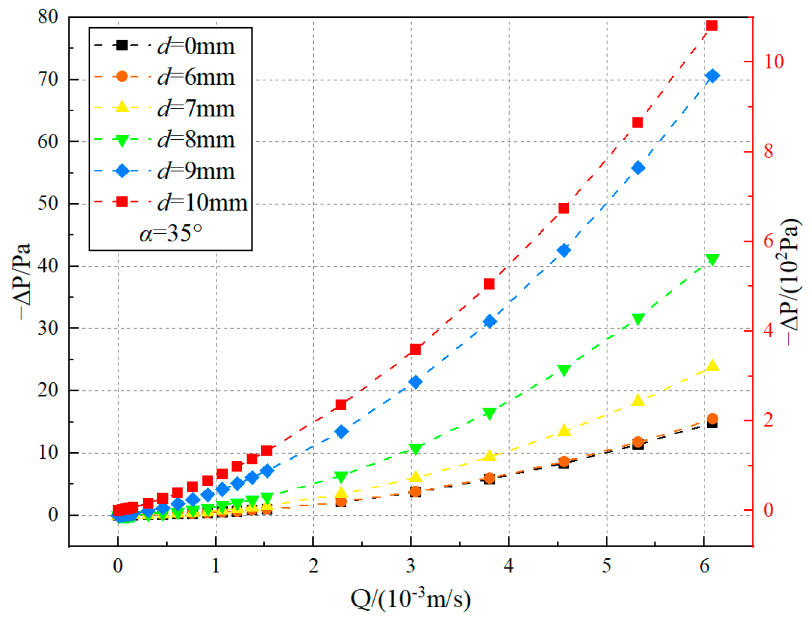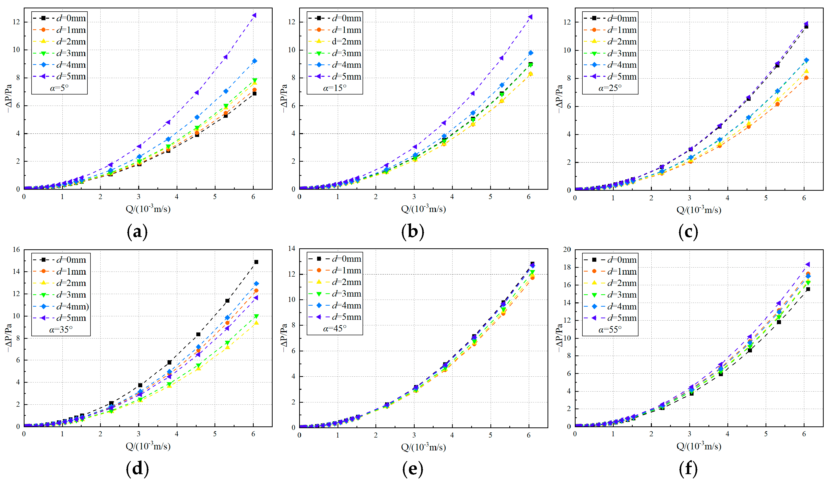 Figure 13. Pressure drop-flow rate curves under different particle diameter (d) and inclination angles (α). (a) α = 5°; (b) α = 15°; (c) α = 25°; (d) α = 35°; (e) α = 45°; (f) α = 55°.