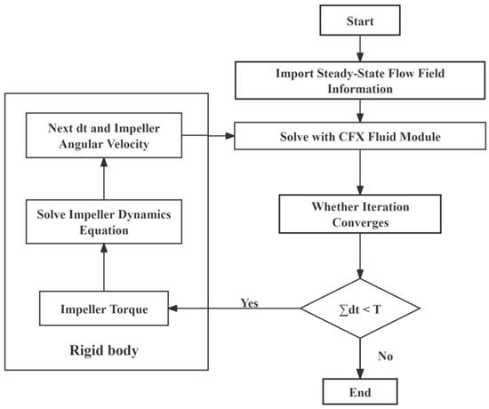 During the unintended shutdown process of series–parallel pumps, a rotational equilibrium exists between the impeller and the surrounding fluid within the impeller flow passages. The computation of the internal flow field and the prediction of the impeller’s rigid-body motion are therefore strongly coupled. In this study, the CFX Rigid Body module was employed to predict the transient rotational speed of the impeller based on the rotational equilibrium equation. The impeller’s rotating domain was defined as a rigid-body subdomain within the overall flow field, and its motion was automatically solved during the simulation by specifying the initial angular velocity, moment of inertia, and mass. Compared with dynamic mesh methods—which require continuous mesh deformation or remeshing and may suffer from mesh distortion under large rotational decelerations—the Rigid Body approach avoids mesh-quality degradation and reduces computational cost while maintaining numerical stability. This makes it a more suitable and efficient choice for simulating the rapid deceleration process during unexpected pump shutdown. The calculation procedure is illustrated in Figure 1, and the governing rotational equilibrium equation for the rotating domain can be expressed as follows: