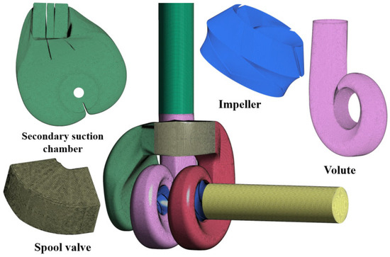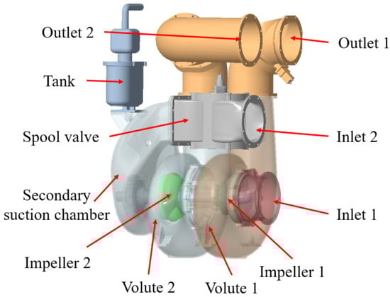 This study investigates a newly designed series–parallel pump system, consisting of a primary pump, secondary pumps, a bell-shaped suction chamber, and a slide valve. The primary and secondary pumps are symmetrically arranged as mixed-flow pumps, with their series-parallel operation achieved through the slide valve mechanism. The physical model of series-parallel pump is illustrated in Figure 3.