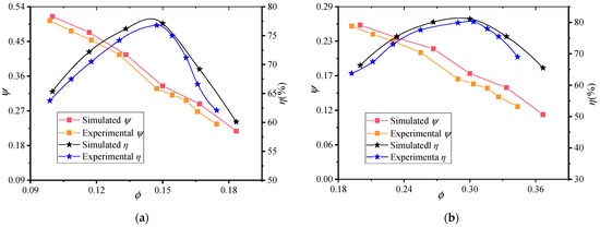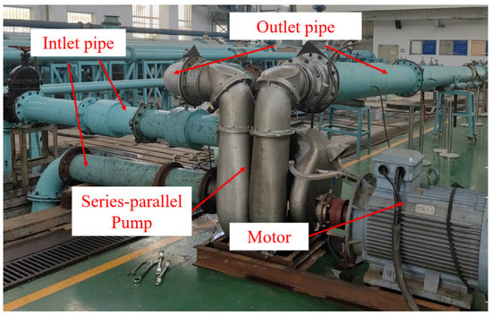 Figure 6 illustrates the experimental setup, and Figure 7 shows the comparison between the numerical simulation and experimental results. From the comparison, the maximum relative error of head coefficient and hydraulic efficiency test and simulation under series and parallel working conditions is less than 5%, which proves the correctness and feasibility of the numerical simulation method adopted in this study.