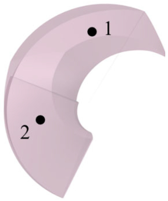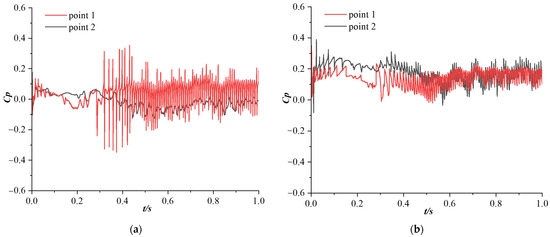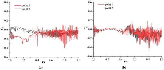 In order to analyze the pressure pulsation characteristics of series and parallel pumps in emergency drainage during large flow during shutdown, 1 s start time was selected as the representative working condition. The impeller monitoring points were arranged inside the channel near the inlet and outlet, and the monitoring points rotated with the impeller calculation domain. The specific arrangement is shown in Figure 8.