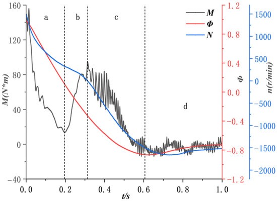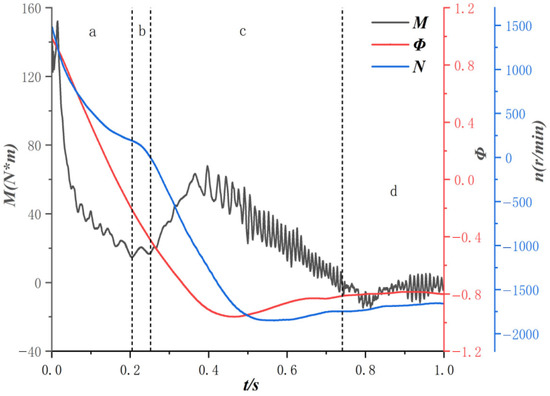 As shown in Figure 9, the external characteristic variation curve demonstrates the operational characteristics of a series-parallel pump during unexpected shutdowns under series operation. The diagram reveals that the entire shutdown process can be divided into four distinct phases: a, b, c, and d. These correspond to the pump’s operating conditions during emergency shutdown conditions, braking conditions, reverse rotation conditions, and runaway conditions, respectively.