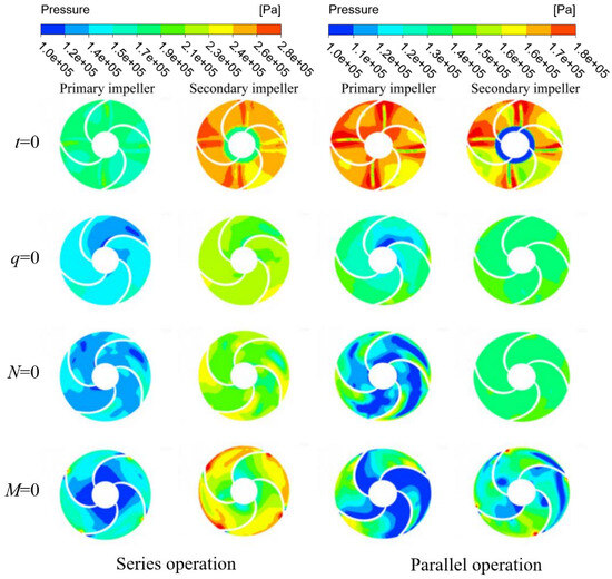 As shown in Figure 11, during the unexpected shutdown under the series-connection condition, the pressure distributions of both the primary and secondary stages exhibit strong similarity. With increasing stage number, the pressure at the secondary impeller cross-sections gradually exceeds that of the primary impeller. After the external load is removed at t = 0 the pressure in the impeller flow passage remains stable, showing a uniform distribution that increases along the radial direction. At q = 0, when opposing flows cancel each other, the overall pressure slightly decreases compared with t = 0, but the radial growth trend remains. At n = 0, reverse-flow impacts generate a high-pressure region near the impeller outlet, while a low-pressure region expands from the inlet along the blade rotation direction, producing significant negative pressure on the suction side. When the system enters the runaway condition at m = 0, the increasing runaway speed raises the pressure and reduces the extent of the low-pressure zone. At the same time, the low-pressure region near the suction-side outlet observed at N = 0 transforms into a high-pressure zone.