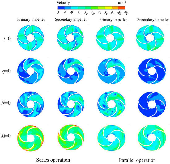 Figure 12 shows the changes in the velocity distribution at the cross-sections of each impeller stage when the initial flow rate is the designed flow rate during the unexpected shutdown of the series–parallel pump in both series and parallel operating conditions.